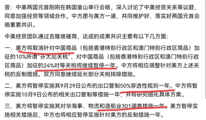 没想到达成的成果如此巨大!美国的几个让步,超出了预期!根据我方新闻稿,美国在三个方面都有不小的让步。其一,芬太尼关税由20%降为10%,而对中国商品加征的24%对等关税将继续暂停一年。其二,50%穿透性规则也暂停一年。其三,美国造船业301调查措施也被暂停一年。 最实在的就得说关税这事儿的让利,之前美国对芬太尼相关产品收着20%的高关税,现在直接砍了一半,降到10%;更关键的是,他们给咱们上千种中国商品加的24%对等关税,也明说要再暂停一年。 这可不是小打小闹,要知道现在美国给日本的对等关税还卡15%呢,就算是跟英国合作,也没这么干脆的让利。有做外贸的朋友算了笔账,就这两项调整,他们公司下半年出口美国的成本能降快三成,光税费就能省两百多万。 更让人意外的是美国在供应链规则上松口了。那个连美国自己企业都怨声载道的50%穿透性规则,总算暂停一年了。可能有人听不明白这规则是啥门道,说白了就是美国之前搞“连坐”,只要中国企业被列进制裁名单,它持股超过50%的子公司也会被一并封杀,不准买美国的技术和产品。 这规则一出来,甲骨文、亚马逊那些美国大公司最先扛不住,因为他们跟中国供应链绑得太紧,几十亿美元的出口订单直接卡那儿动不了,后来干脆组团去白宫门口游说抗议。现在这规则暂停,不光咱们的企业松了口气,那些靠中国市场吃饭的美国公司,估计也在偷偷乐。 美国针对造船业的301调查也给摁下暂停键了,这对咱们做海事物流和造船的企业来说,简直是及时雨。以前美国动不动就拿301条款搞调查,一不高兴就威胁加税,国内几家大造船企业都不敢接美国的长期订单。 这次谈完,中国商务部明说了,双方在这事儿上已经有初步共识,等于给整个行业吃了颗定心丸。要知道咱们的造船业在全球占了快一半的份额,美国想绕开咱们自己搞造船,根本不现实,暂停调查其实是两边都划算。 把这三项让步凑一块儿看,美国等于是直接退回到今年4月9号之前的状态了。这轮贸易战折腾半天,到最后他们实际给咱们加的关税,怕是只剩10%。有老外贸人感慨,这比2018年贸易战刚开打的时候强多了,那时候最惨的时候关税加到30%,不少小企业实在扛不住,只能转去做东南亚市场。现在关税降下来,他们又能把之前丢的美国客户给抢回来了。 当然,国际贸易讲究个有来有往,美国让了这么大的步,咱们也在几个领域做出了回应。比如农产品进口这块,咱们承诺今年多买200万吨美国大豆,这对受国际粮价波动影响的美国农场主来说,可是个好消息。 能源领域也有新动作,国内几家石化企业跟美国能源公司签了长期的液化天然气采购协议,既稳住了咱们的能源供应,也给美国能源出口找了个稳定买家。 服务贸易方面咱们也适当放宽了限制,比如允许美国部分金融机构参与国内的基金托管业务,这也是美国金融圈一直想争取的。不过咱们这些让步可不是单方面吃亏,都是结合自身需求的合理安排,比如多进口大豆能稳住国内的饲料价格,引进美国金融机构也能倒逼咱们自己的金融业更有竞争力。 其实美国这次放软身段,说到底还是为了自己的利益。一方面,他们国内企业压力太大,那些依赖中国供应链的行业天天往政府施压;另一方面,中国这市场实在绕不开,上半年咱们社会消费品零售总额都突破24.5万亿了,这么大一块蛋糕,谁都不想弄丢。就像商务部谈判代表李成钢说的,美方立场是强硬,但咱们维护自身利益的态度也不含糊,最后能谈成,靠的就是相互尊重、平等对话。 不过咱也别太乐观,这些共识还得两边走各自国内的批准流程,以后会不会有变数不好说。而且贸易摩擦这事儿本来就不是一天两天的,这次的让步顶多算阶段性成果。但至少从这次谈判能看出来,咱们中国的市场地位和产业实力,已经足够让美国在贸易谈判中放下架子了。 对咱们来说,不用妄自菲薄,也犯不着沾沾自喜,踏踏实实干好自己的事,把产业链做扎实,把内需市场做大,将来在国际贸易里才能更有底气。 不过咱们也不用盲目乐观,这些共识还需要双方履行国内批准程序,后续会不会有变数还不好说。而且贸易摩擦从来都是长期的,这次的让步只是阶段性成果。但至少从这次磋商能看出来,中国的市场地位和产业实力,已经足够让美国在贸易谈判中放下身段。 对咱们来说,不用妄自菲薄也不用沾沾自喜,继续做好自己的事,把产业链做扎实,把内需市场做大,未来在国际贸易中才能更有底气。