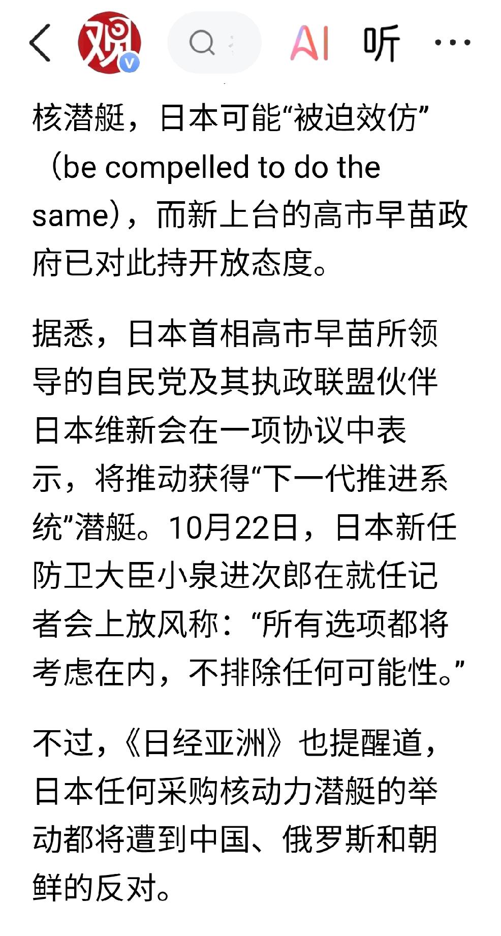 日本:践踏红线 个人观点:日本预想效仿韩国,在美国采购核潜艇。 日本预想践踏中国的红线吗? 这是在玩火吗? 果然如同猜想的那样,那就多管齐下。外交:在联合国,在国际合约,在历史,在民众情感诸多方面争取国际民众的支持,占据舆论制高点;同时在军备武器方面,做好准备;在国际上,也要争取尽可能多的国家,支持我们合理合法合情的要求。