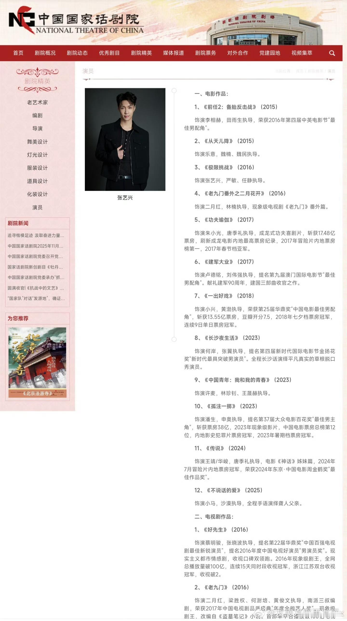 张艺兴权威[666]国家话剧院官网剧院精英栏更新,张艺兴的公式照和介绍。作品厚度清晰可见!提名、票房成绩、大爆现象级!官方认证的实绩!