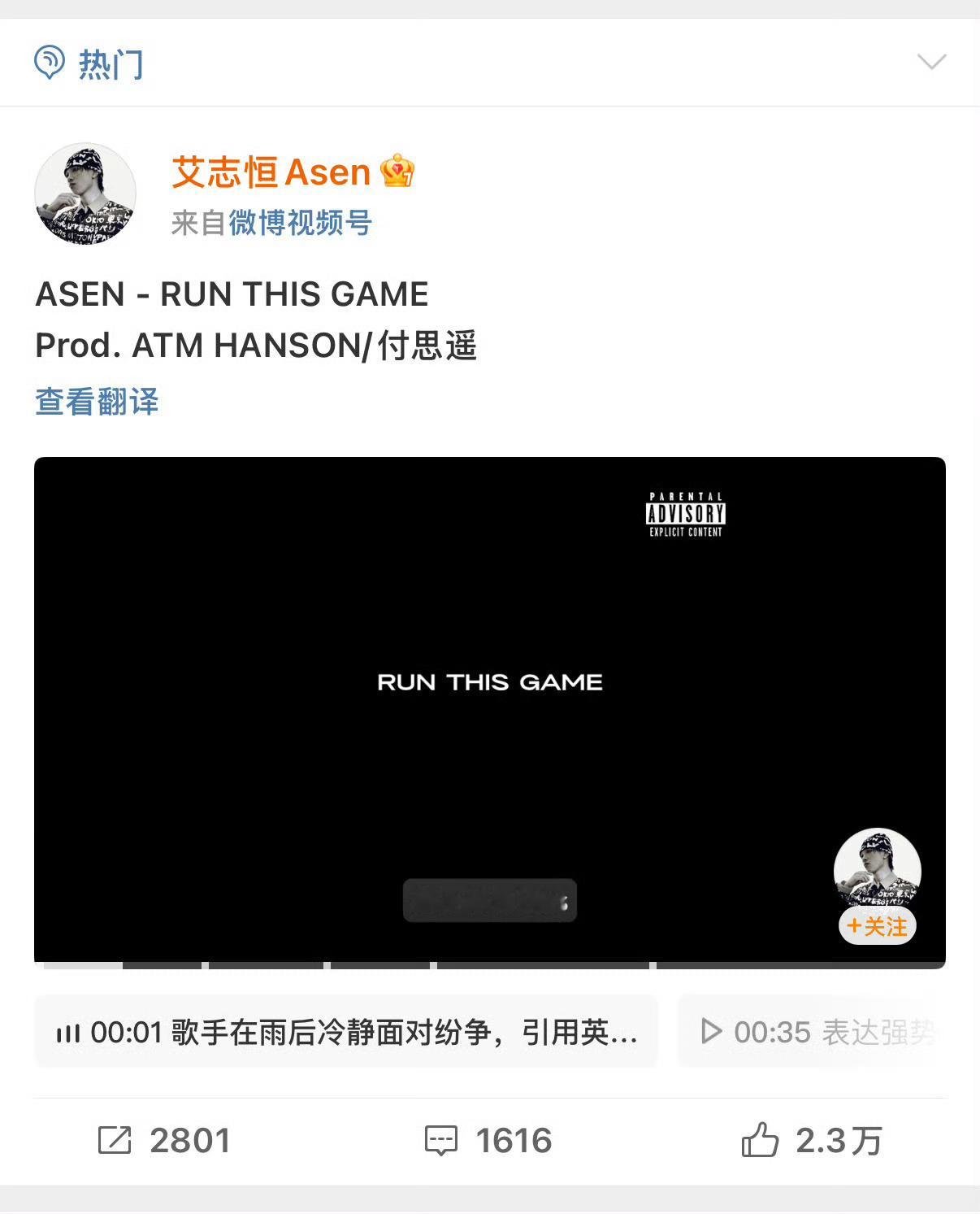 10月28日晚,Asen在社交平台发布声明,强调“说唱不是网络游戏,我已赢一次,No Round 2”,宣称因妻子怀孕拒绝参与骂战,但随后他又转发了队友Kiv和Sakee针对活死人厂牌的diss歌曲,之后这条声明微博被删除。Asen的这些删博行为被网友认为是在控评怕翻车,他一边拿别人隐私当弹药,一边却删微博清恶评,这种行为也引发了关于说唱圈“Real”精神的讨论。