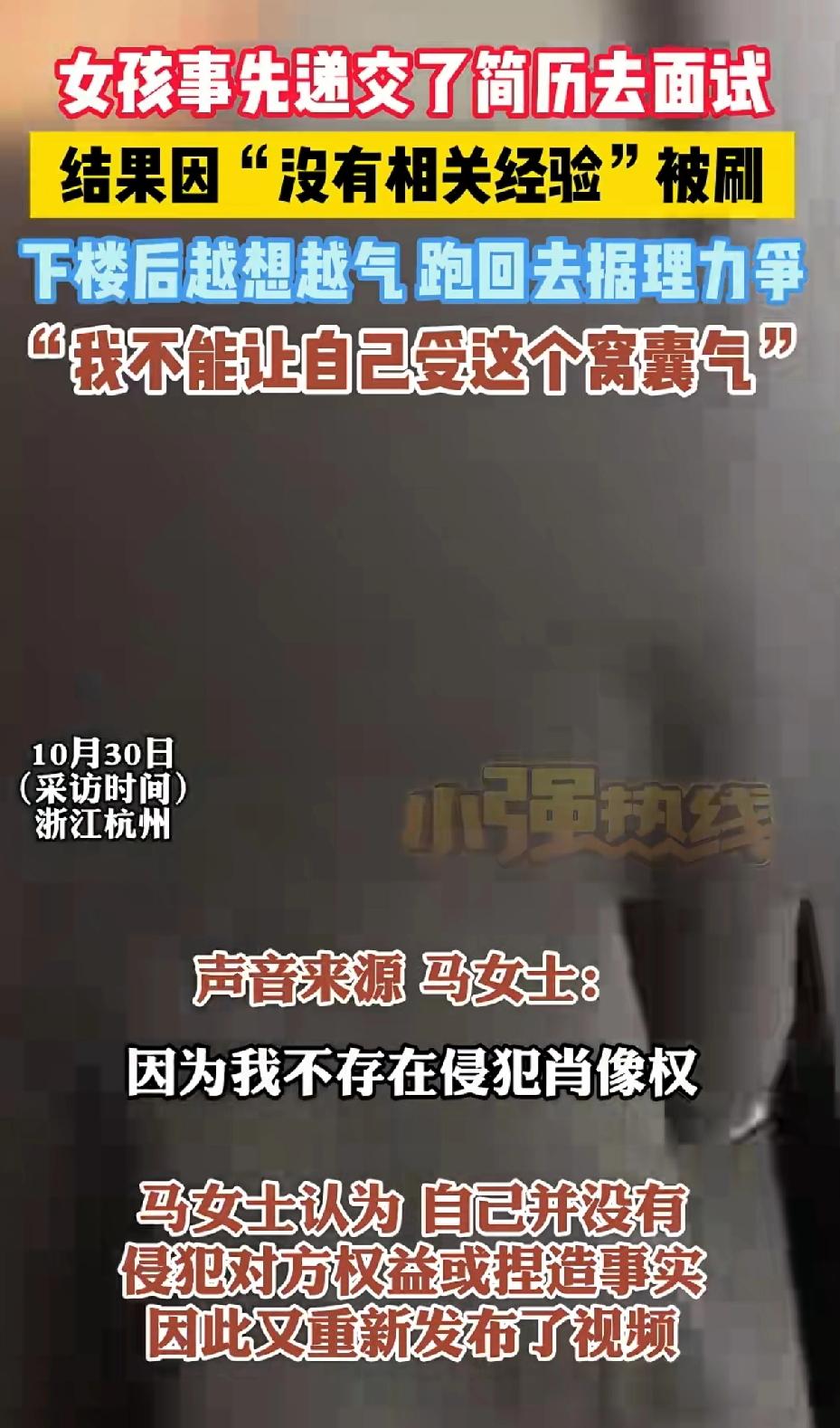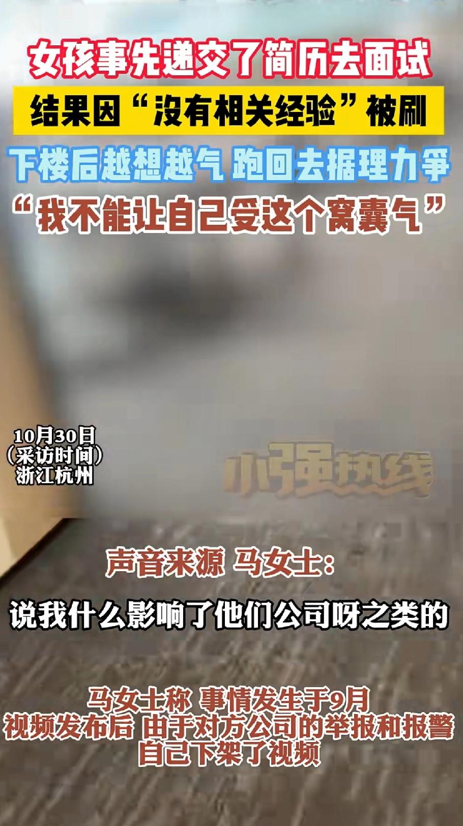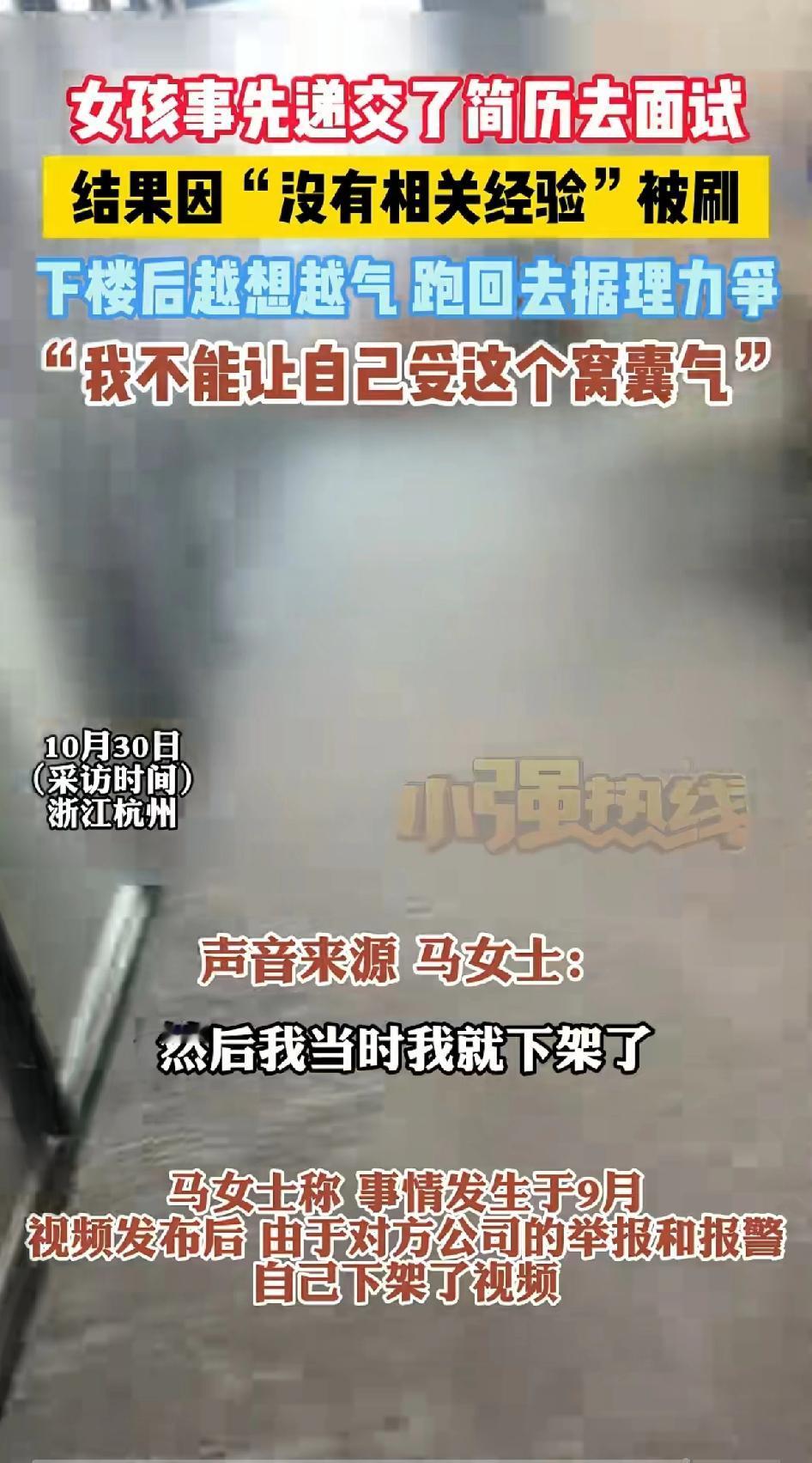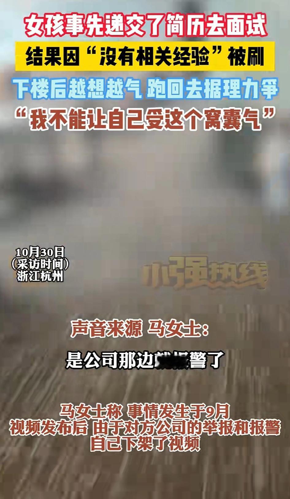 女孩事先递交了简历去面试,结果因“没有工作经验” 被刷,下楼后越想越气, 跑回去据理力争!“我不想受这个受这个窝囊气” 面试的马女士跑大老远去公司面试,因没有工作经验被刷,下楼后越想越气,随后返回该公司,质问面试负责人施女士。 公司招聘,既然不要没有“经验”的,为什么不提前说明?天气炎热, 路途遥远。 却不提前告知,让面试者大老远跑过去,时间和往返车费谁来替自己承担? 面对马女士的质问,面试人员没有任何解释,只是一味地躲避! 最后公司选择报警,还说马女士影响公司运营。 看到他们报警马女士更加气愤,公司非但不解释清楚,还要公司内部人员举报自己的上传的视频!由于对方的报警和举报,自己下架了视频。 马女士:一没有侵犯肖像权,二没有侵害对方权益,没有捏造事实。 因此又重新发布视频。 这公司招聘人员从不考虑别人的死活,都是等米下锅的人!不要没经验的,在招聘要求里写清楚就行了。 没有写清楚面对人家的质问跟人家说清楚,来回车费给人家报销了不就行了。 这不是耍人家玩吗?遇上这点小事还报警处理,这种公司这点小事都处理不好,马女士不进这种公司也是幸事!