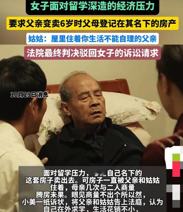 “小棉袄变黑心棉?”广东珠海,父母买了套房子,登记在年仅6岁的女儿名下,因感情不和离婚后,母亲带走女儿生活,父亲则住在了房子里。转眼多年过去了,女儿因留学深造经济压力大,认为房子是自己的,欲让患重病的父亲搬走,把房子卖了变现,遭拒后,一纸诉状将父亲以及照顾父亲的姑姑告上法庭,法院这样判! “这就是我的亲女儿,真的是养了一头狼啊....” 2008年,小美的父母买了这套80多平方米的房子。 那时候,她才4岁,虽然还不懂什么是房产,但这套房子成了她和父母生活的重要一部分。 父母的经济条件还算不错,房子位于市中心的一处新开发小区,周围交通便利,环境优美,是他们为未来打算的家。 随着小美的成长,父母对她的宠爱与关怀始终未曾改变。 2013年,小美的父母因为感情问题走到了婚姻的尽头。 那年,小美刚满6岁,她并不完全理解父母之间的纷争,只是隐约察觉到家里气氛的变化。父母经常在她面前争吵,母亲有时会独自躲到房间里,眼里闪烁着泪光,而父亲则显得异常沉默。 最终,父母选择了离婚,而这套80平方米的房子名字也改成了小美。 离婚后的生活发生了剧变。小美跟随母亲生活,搬进了另一套不那么宽敞的房子。那是一套二手房,面积不大,布局简单,但母亲努力布置,让它看起来温馨。尽管物质条件略有差距,母亲却给了她更多的陪伴和爱。小美和母亲的关系也因此变得更加紧密。 随着时间的推移,小美逐渐适应了与母亲的生活,而父亲则在她的记忆中渐行渐远。12岁以后,她和父亲见面的次数变得越来越少。 几年来,小美已经成长为一名即将本科毕业的年轻人,眼看着大学生活即将结束,她开始考虑自己未来的道路。虽然她一直渴望能继续深造,但家里的经济状况却让她的计划变得更加艰难。 面对高昂的学费和生活费用,小美开始考虑将自己名下的那套房子出售,用来缓解家庭经济压力。 这套房子目前却由她的父亲和姑姑共同居住,这也让她面临了一个不小的难题。 小美的母亲曾多次与父亲和姑姑商量,希望他们能搬出这套房子,好让她把房子卖掉,然而始终未能达成一致。眼看着自己在外求学的生活成本越来越大,小美终于决定采取更直接的方式,她将父亲和姑姑告上了法庭,要求他们搬走。 她表示,自己作为家里的唯一独生子女,面临着深造的巨大资金压力,而房子是她名下的财产,理应由她来决定其处置方式。 她还引用了“羊有跪乳之恩,鸦有反哺之义”的说法,认为自己有权要求父亲从房屋中搬出。 法院在审理过程中认为,小美作为女儿,理应对父亲负有一定的赡养义务,尤其是考虑到父亲目前患病且没有其他房产的情况。 法院指出,小美虽然有深造的需求,但仅以此为由要求父亲搬走,明显有违社会公序良俗。 法院还强调,小美的父亲在患病期间需要有人照料,而他的姐姐—即小美的姑姑,正是承担了这个责任。姑姑住在这套房子里,并没有不当行为,且小美并未能提供充分的证据证明姑姑存在恶意占有房屋的情况。 最终,法院在经过充分审理后,驳回了小美的全部诉求。法官认为,家庭成员之间的财产争议不仅涉及法律,也牵涉到亲情和社会伦理,特别是在父亲患病、姑姑照料的背景下,强制要求搬离房屋并不符合公正与合理的原则。