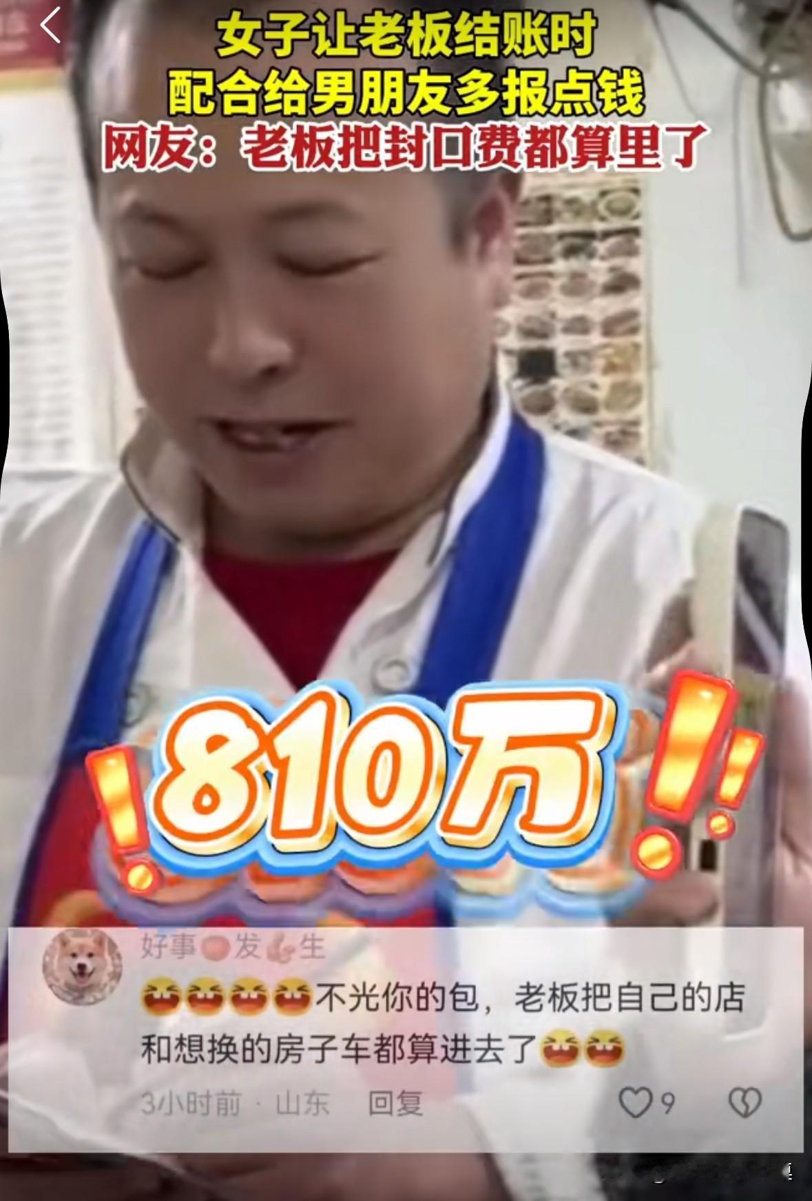 吉林女子带着男朋友去饭店吃饭,期间女子偷偷到后厨跟老板说:“一会我男朋友来结账,你多说点,我想买个包。” 老板一口答应:“行!” 吃完后,男友问:“多少钱?” 老板说:“810万!”男友直接懵圈了! 评论区:“不光你的包,老板把自己想换的房子和车都算里边了。” 对了,还有封口费! 我发现,现在情侣出去约会,全程男友买单,不像我们90后,满脑子都是AA,总觉得没有跟人结婚,就不能花别人钱。