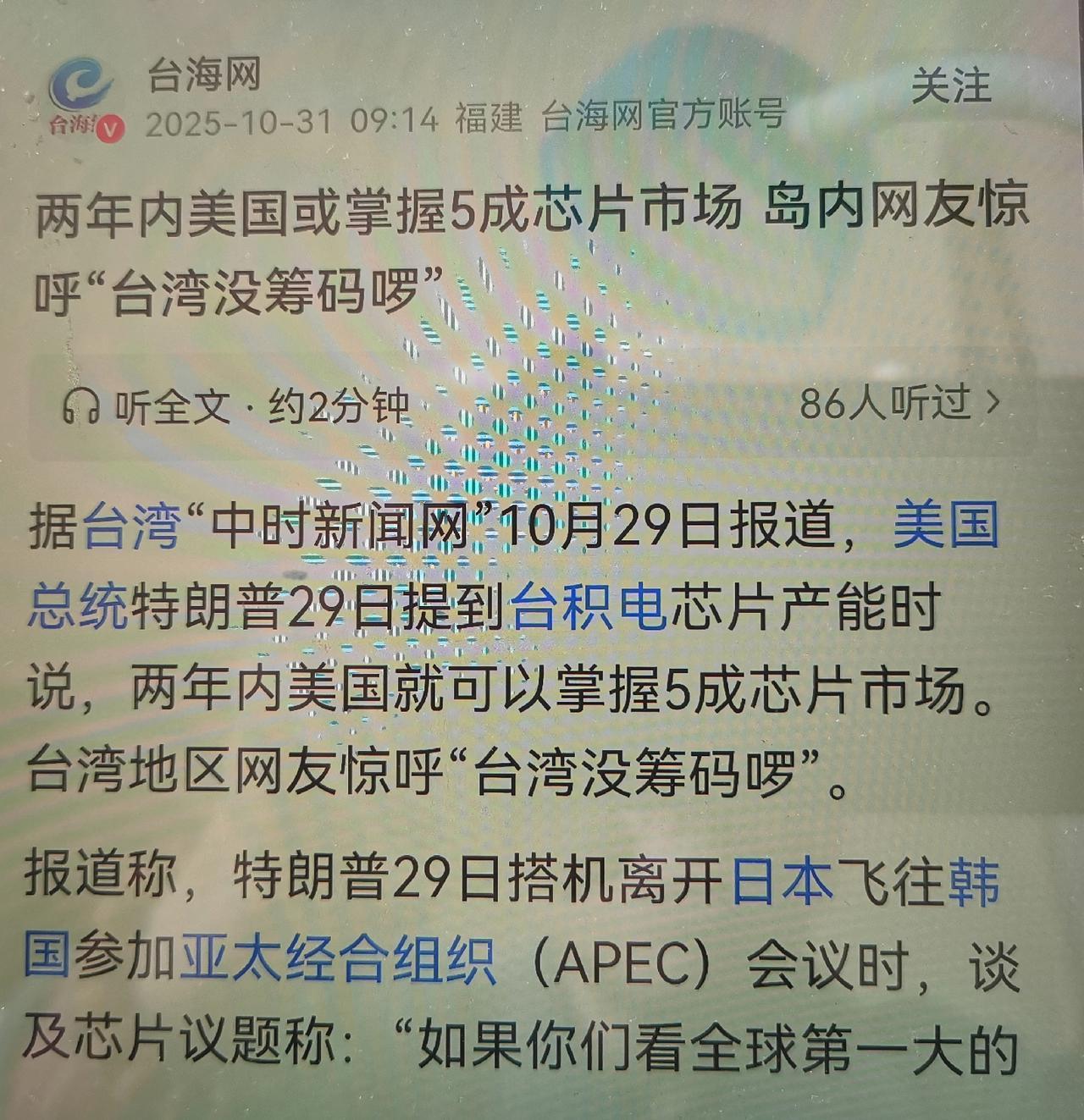 特朗普:美国两年内或掌握五成芯片市场,台湾担忧 个人观点:在最后一步,武统台湾之前,理想的情况是:“不战而屈人之兵,台湾自己回归。” 所以,当下以及将来都会为着这一目标而努力。 个人:相信台湾自己回归。就差你一个了,呼叫台湾。