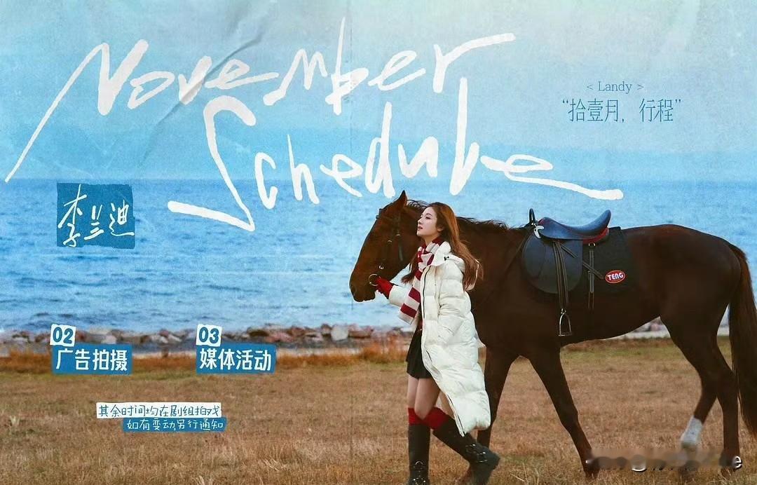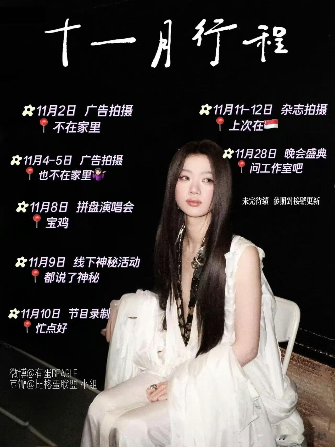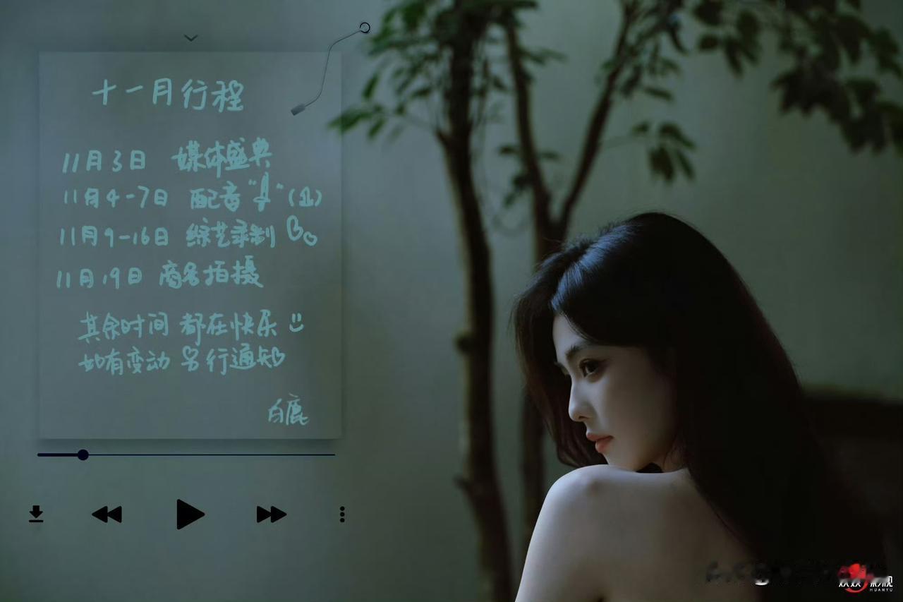 10月31日,刘诗诗,白鹿,宋轶,单依纯,李一桐,侯明昊,陈都灵,卢昱晓,李兰迪,11月行程图,大家有忙有闲,白鹿有快乐! 白鹿之前提前请假说要休息一段时间,很多人以为她完全不工作了,其实并不是,还是会工作,只是暂时不拍戏不进组了,其他还是照常的,有要找白鹿的商务可以找~ 刘诗诗下个月进组,这个月行程不多,自从一念关山复出后,感觉她就没停过,这次正好好好休息一下,下个月状态满满进组! 侯明昊11月挺忙的,把工作在新剧开拍前完成,接下来全身心投入新剧组,我还挺好奇他的,期待他去桃花坞,如果真不错,应该能拉一波路人缘!