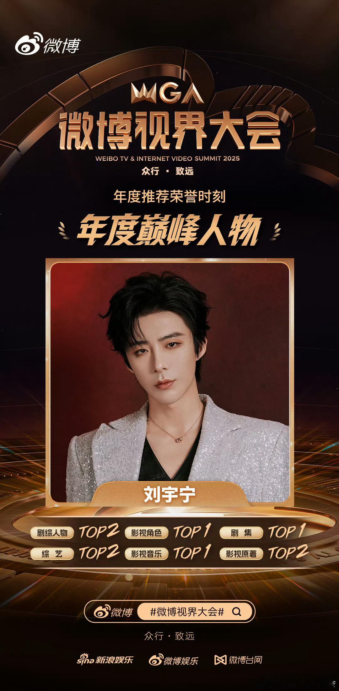 2025微博视界大会,刘宇宁凭剧综人物TOP2、影视角色TOP1、剧集TOP1、综艺TOP2、影视音乐TOP1、影视原著TOP2的“六边形”实力,斩获“年度巅峰人物”!