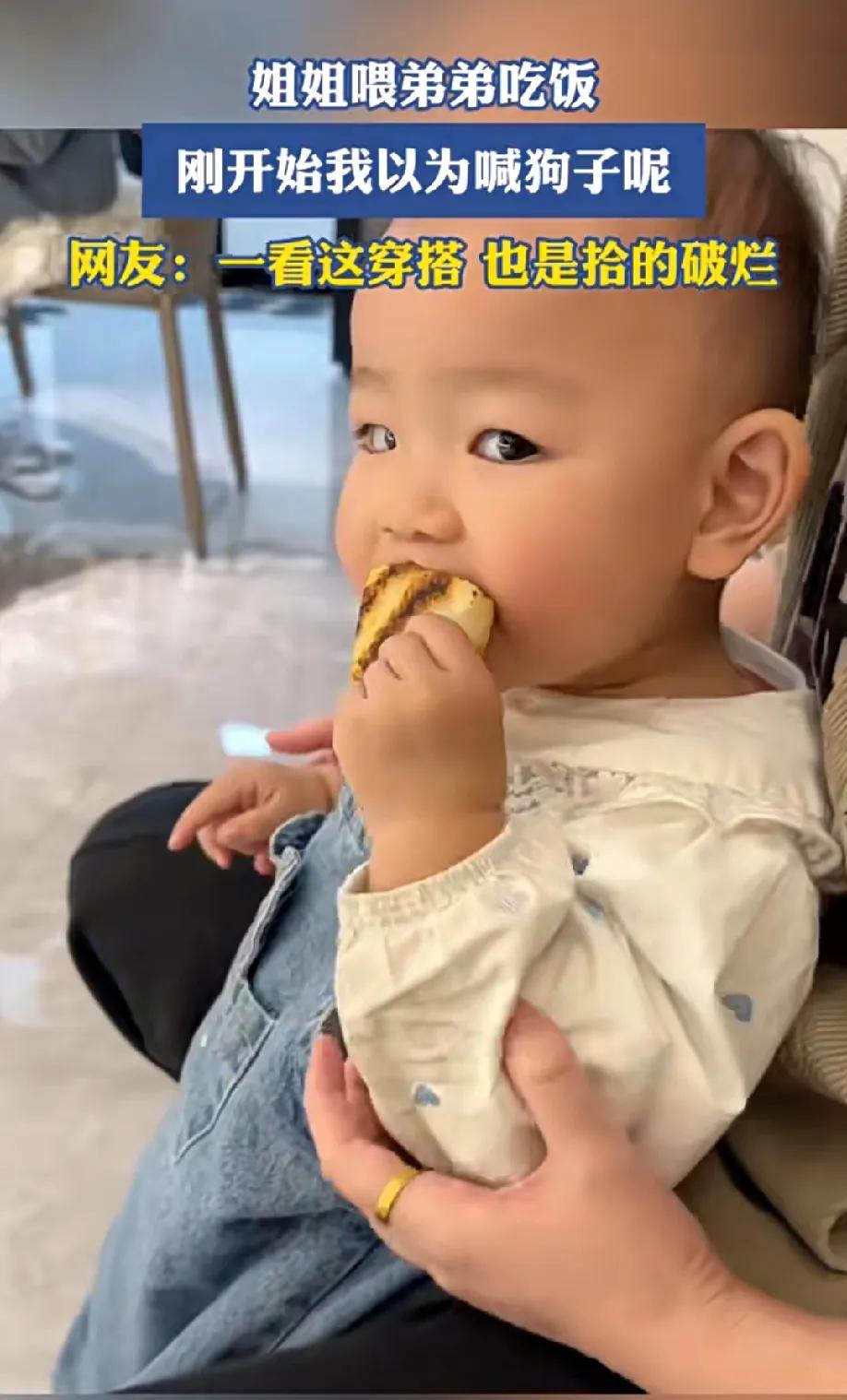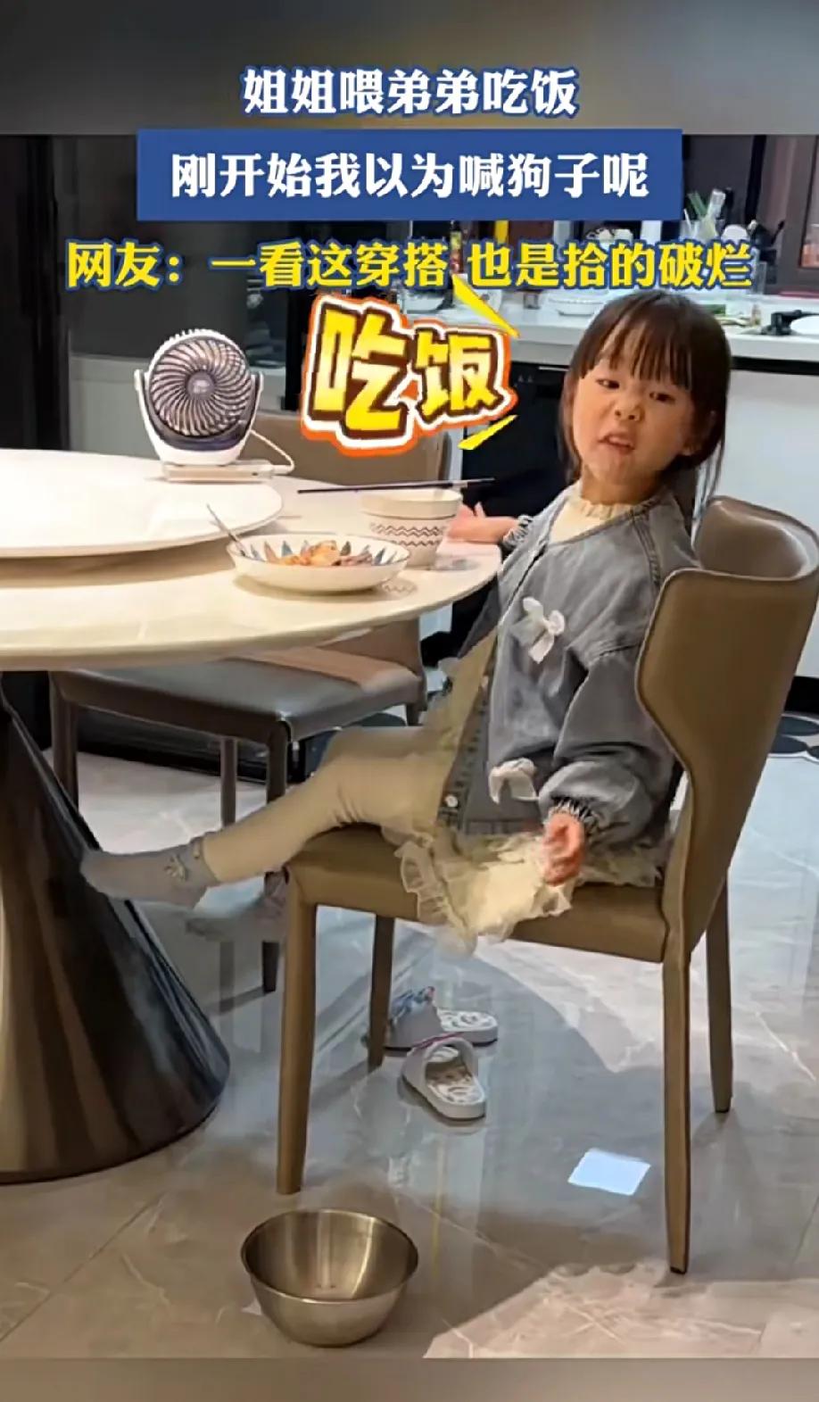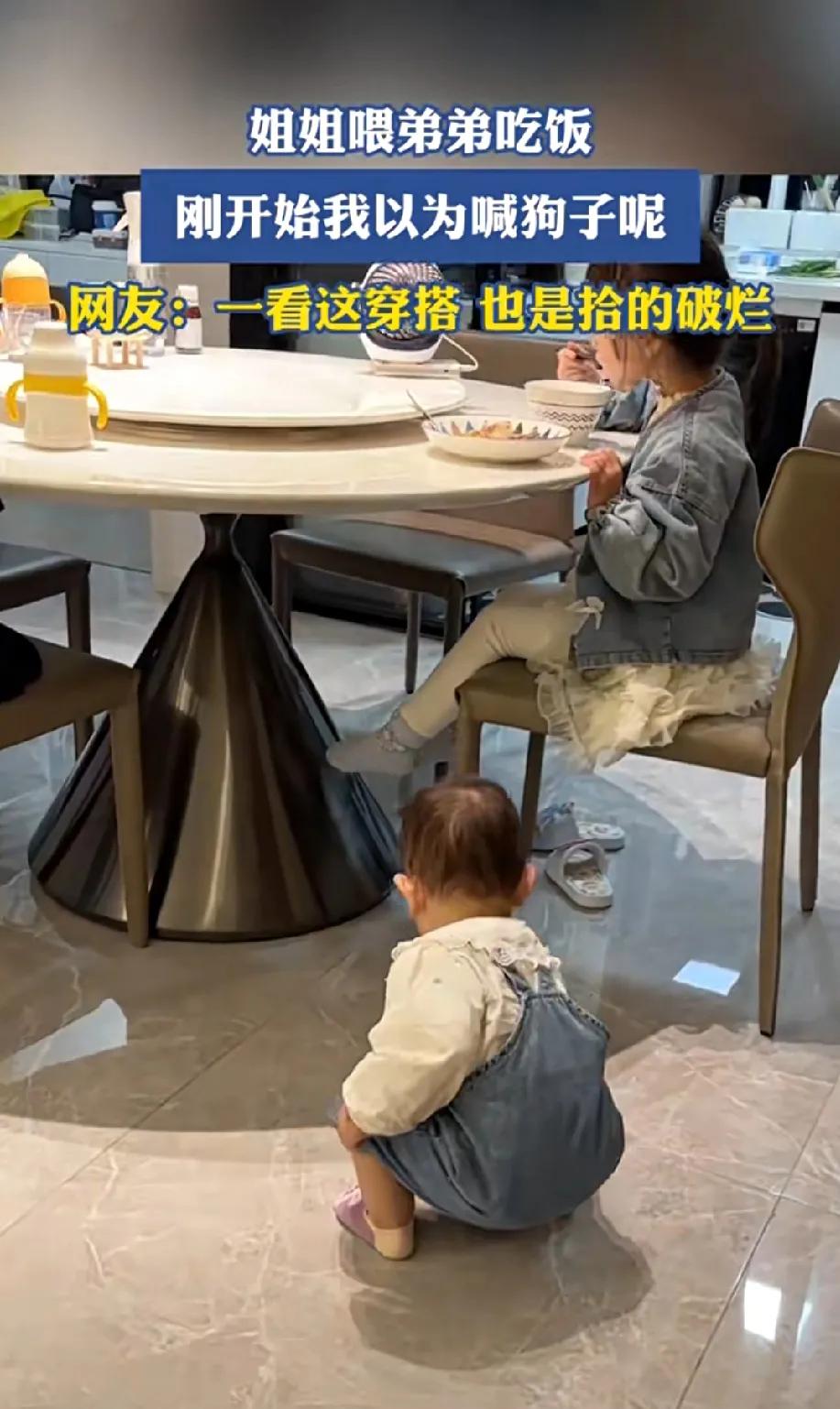 姐姐坐桌子上吃饭,扔下一块饼在地上的碗里,奶凶奶凶喊了一声,“吃饭!” 接着,一弟弟穿着蕾丝衬衫加背带裤,一摇一摆,很自然得捡起饼,跑回妈妈旁边吃。 姐姐那表情,那语气,还扔到地上的碗里,要不是弟弟出现,真以为是喊狗子吃饭。弟弟拿起饼就啃,吃着还很香,配上妈妈魔性的笑声,这画面感具好笑!姐姐克弟弟,血脉压制! 富养女儿,穷养儿子是没错,但蕾丝衬衫给儿子穿,是不是过了点?不说是弟弟,还以为是妹妹!在家里没人看到可以,在外面还是要注意一下的。 三岁看到老,姐姐这才多大,这傲慢的小表情,扔到地上的碗里。这态度应该家长纠正下,最起码要学会尊重人,包括弟弟。 现在是好笑童趣,但是长大了就是后患无穷了。