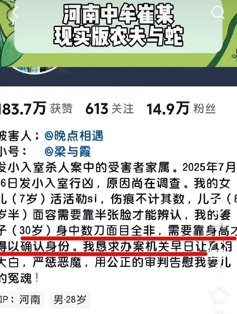 这哪是低估人性恶是善良喂了白眼狼!河南那对30岁夫妻,掏心掏肺帮发小,最后连老婆带俩娃都被他害了,看完聊天记录心都揪碎了! 夫妻俩多好啊,结婚10年还甜得冒泡泡,一个挣钱一个带娃,日子过得顺顺当当。对发小崔某某更是没话说,给住给吃,连家门钥匙都没防着他——结果人家偷偷配了钥匙,趁丈夫在外省,把娘仨全害了。 最让人寒心的是,他们把人当兄弟,人却把他们的信任当刀。不是说不能善良,是真的别把“熟人”当免罪符,钥匙别乱给,家门别随便让外人进。 这事大家怎么看呢!