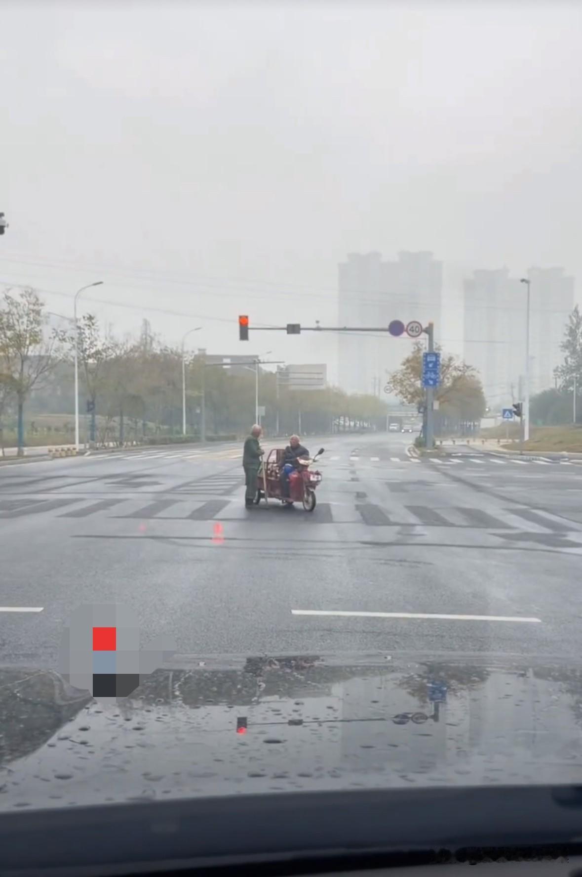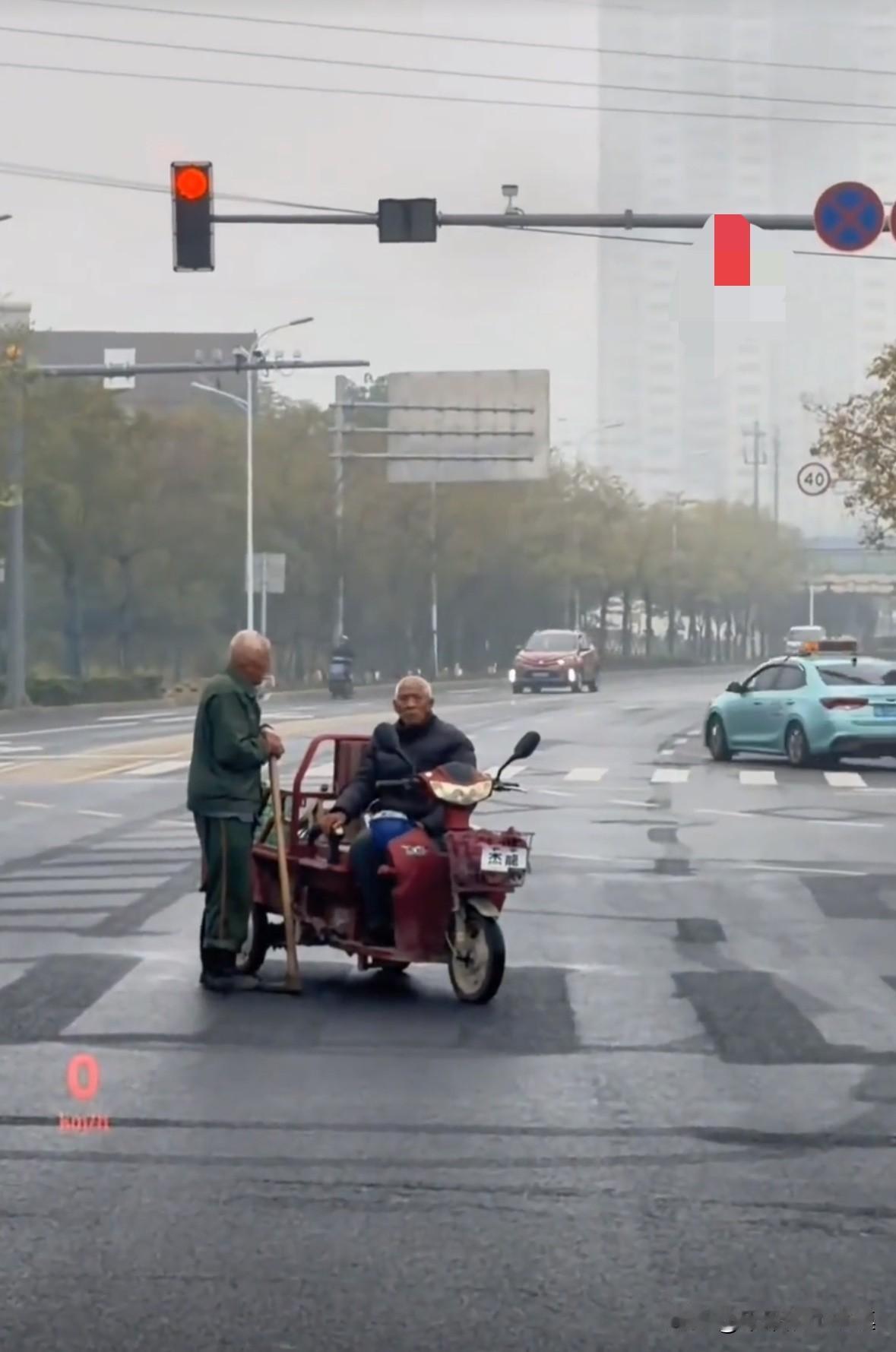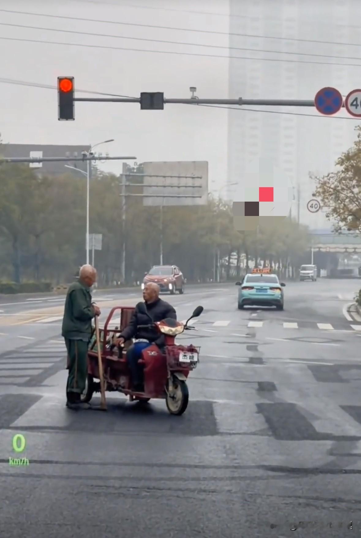 两个老人在红绿灯下聊天,真是把马路当他家客厅了。 路上来往车辆很多,两个老人完全不管不顾! 开车可小心一点,就算这样,开车碰到了,也能让你倾家荡产。老同事聊天