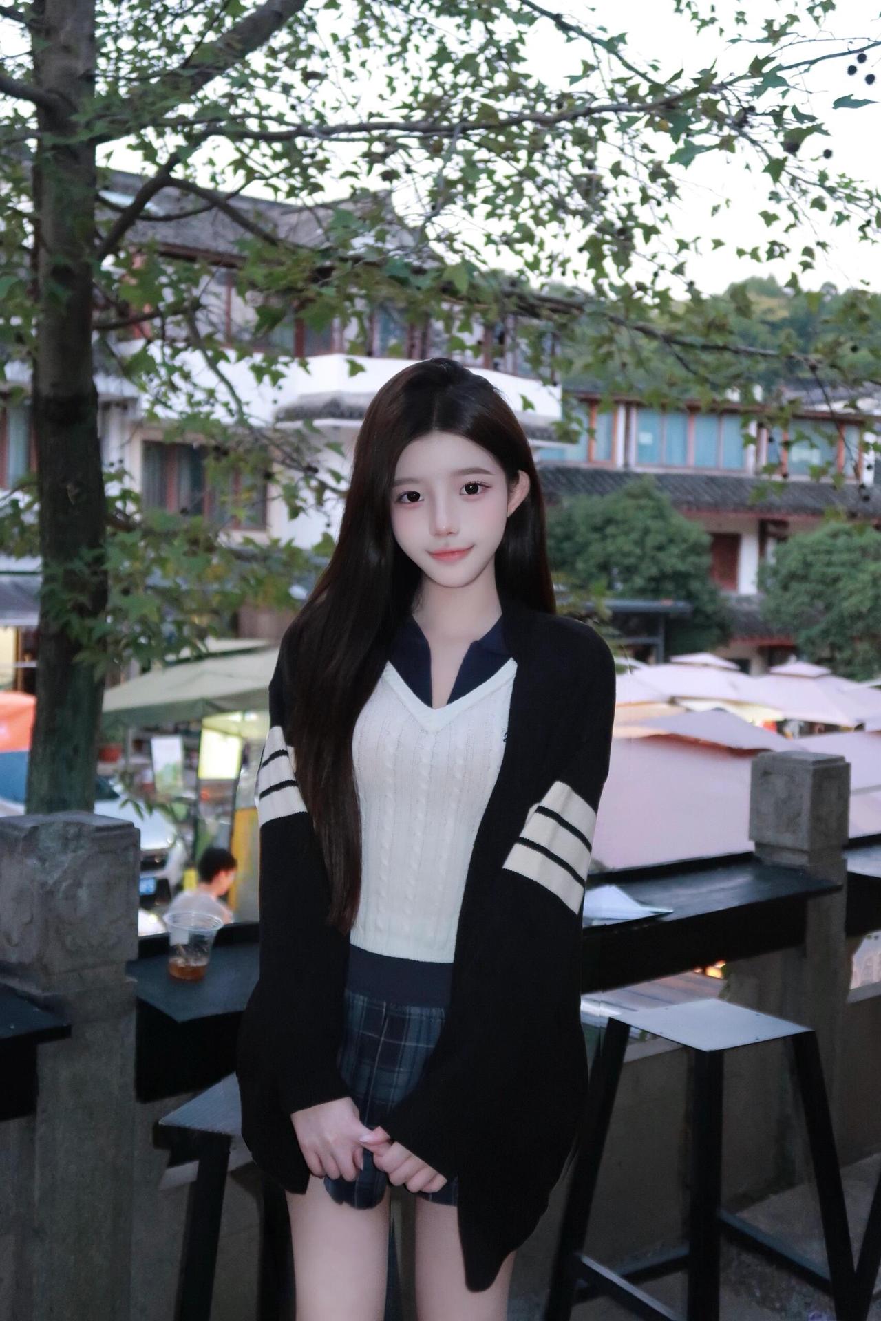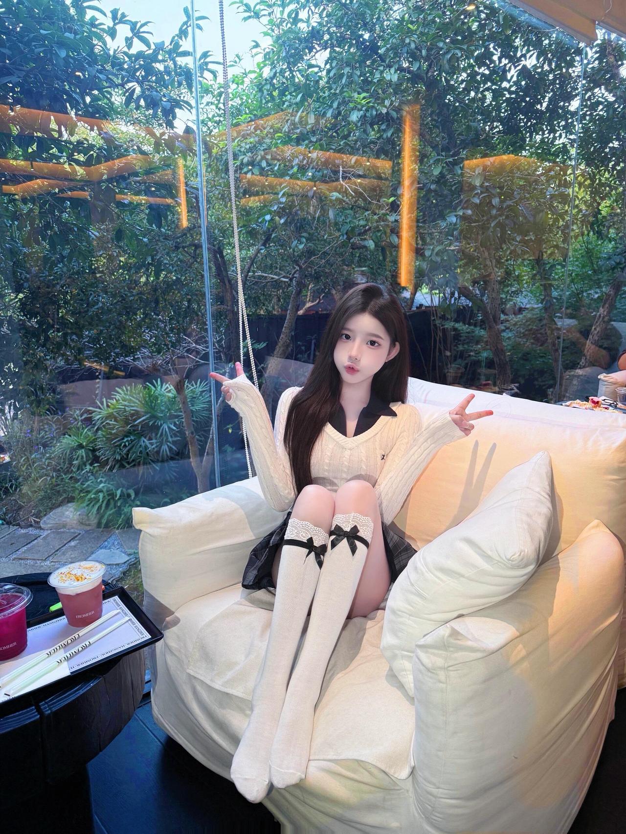 她身着白色短款针织上衣,搭配高腰微喇牛仔裤,脚踩白色运动鞋,粉色链条包点缀,休闲
