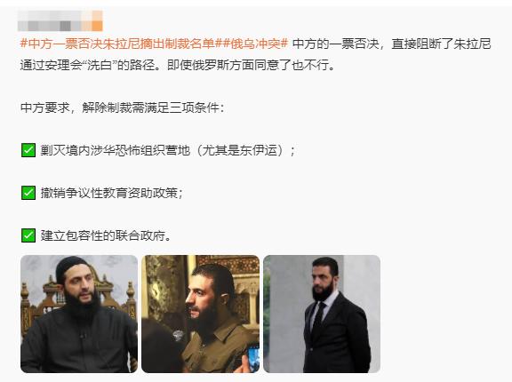 朱拉尼想从制裁名单中洗白,先问问大国同意不同意!朱拉尼就是这样的情况,不要用自己的影响力,试图蒙混过关,那是不可能的。朱拉尼不把涉及到大国的问题给处理干净,那绝对不可能从制裁名单中出来,哪怕是英、法、德三国都支持朱拉尼,那也不行。甚至俄罗斯方面,也可能放开了对朱拉尼的制裁。 但是咱们这一关,朱拉尼可没那么好过去,要知道一票否决权,咱们用的不多,但是针对朱拉尼的话,要是不做出改变,这个一票否决是不可能过去的。所以针对联合国针对朱拉尼的制裁,必须要继续下去,针对朱拉尼的制裁就继续,反正就是这么个情况,朱拉尼别想蒙混过关。 之前咱们国内网络上,有很多赞扬朱拉尼的评论和消息,大家闭眼就知道,肯定是某些组织拿了钱来称赞朱拉尼。但是现在咱们国家的态度很明确,就是不肯解开对朱拉尼的制裁,那么那情况就很明显了,朱拉尼就是做的不到位,就继续被制裁。 朱拉尼想要获得承认,那就较量一下看看。
