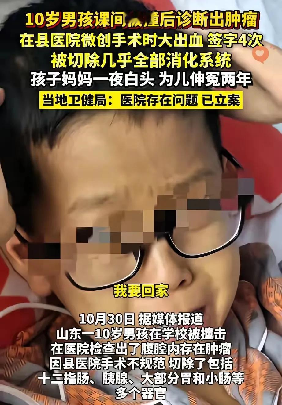 10岁男孩小烨因为肿瘤被误诊,腹部开了14个小时,切除了6个器官,不能进食,不能进水,只能靠静脉营养和排泄袋活着。 家属质疑医德,认为医生就是拿孩子的生命开玩笑,把孩子的未来都毁了。 医疗事故,两个多月才立案。 家属的律师已经介入了。法律上的问题不知多久才能有结果。 看到孩子的遭遇,心里很难受,医患关系本来就很脆弱,这种事情发生后,医院和医生怎么承担责任才能让家属心里接受? 听说医生现在不敢接这个案子,生怕下一个就是自己。 可是,真正应该承担责任的是医院和医生,而不是其他无辜的人。 对这种情况出现的医院和医生,必须严惩,让所有人都知道拿生命开玩笑的下场。 麻烦看官老爷们右上角点击一下“关注”,既方便您进行讨论和分享,又能给您带来不一样的参与感,感谢您的支持!