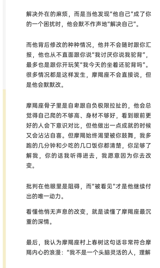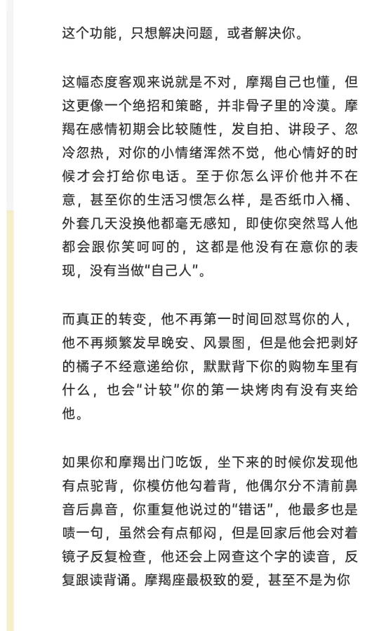 摩羯座表面冷漠,实则极度敏感,常因小事生气却不愿表达。他们通过默默改变来表达关心,渴望被看见和理解。真正的深情在于细水长流的陪伴与支持,而非直接的言语或行动。