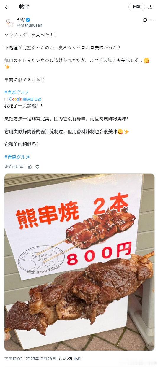 日本熊灾🔻日本人开始吃熊了,800日元两串(约37块钱)[哆啦A梦吃惊][哆啦A梦吃惊]