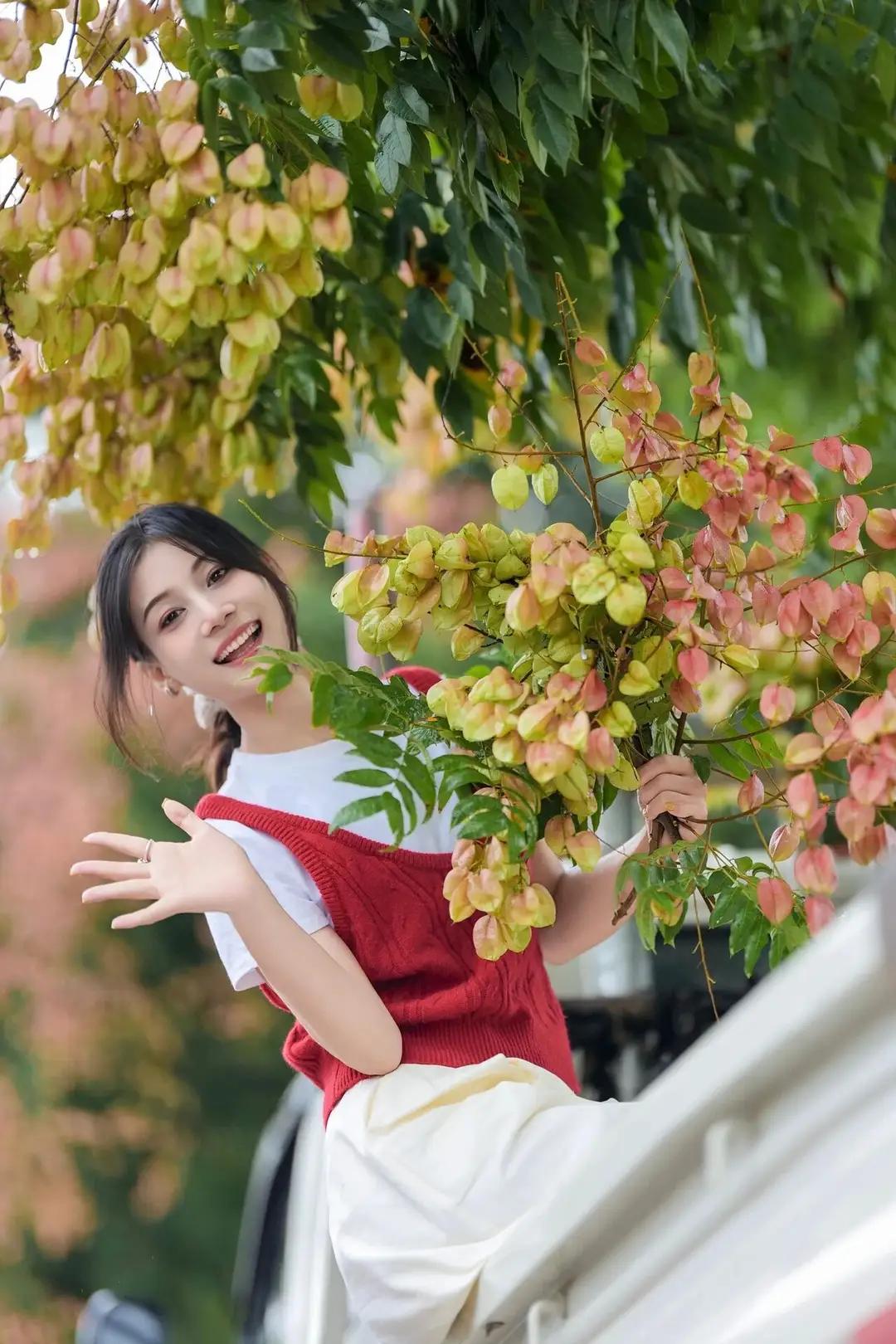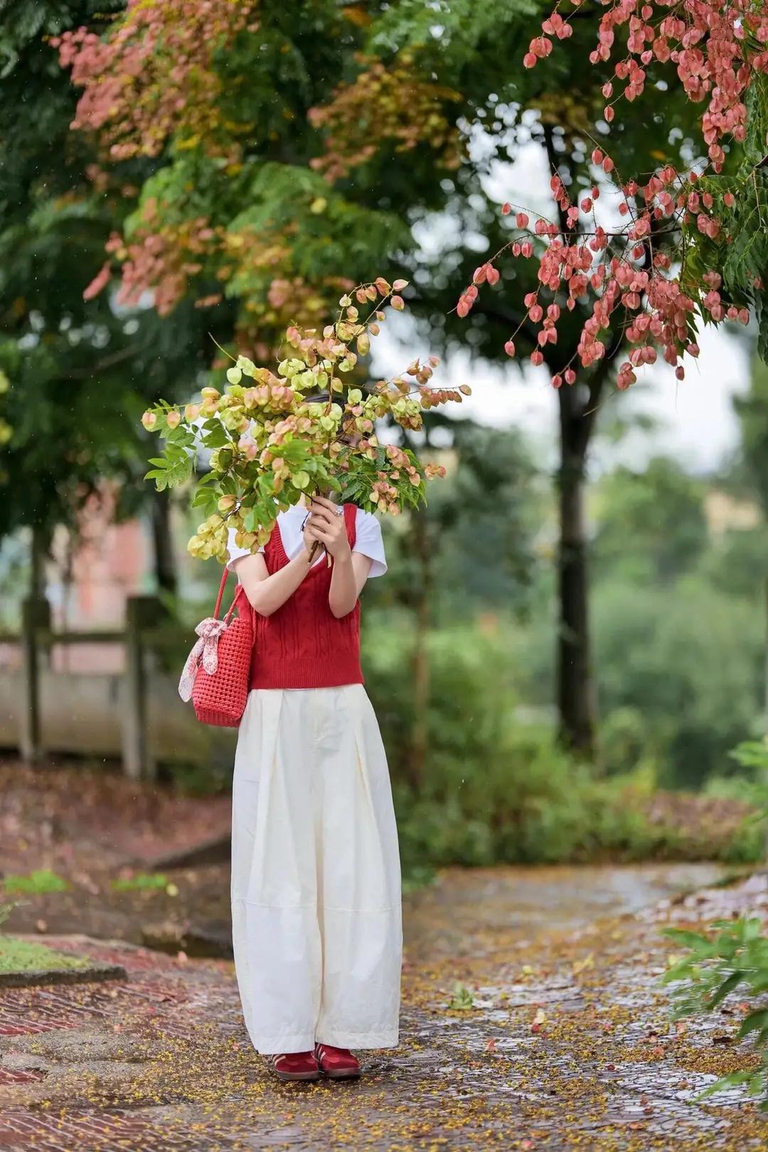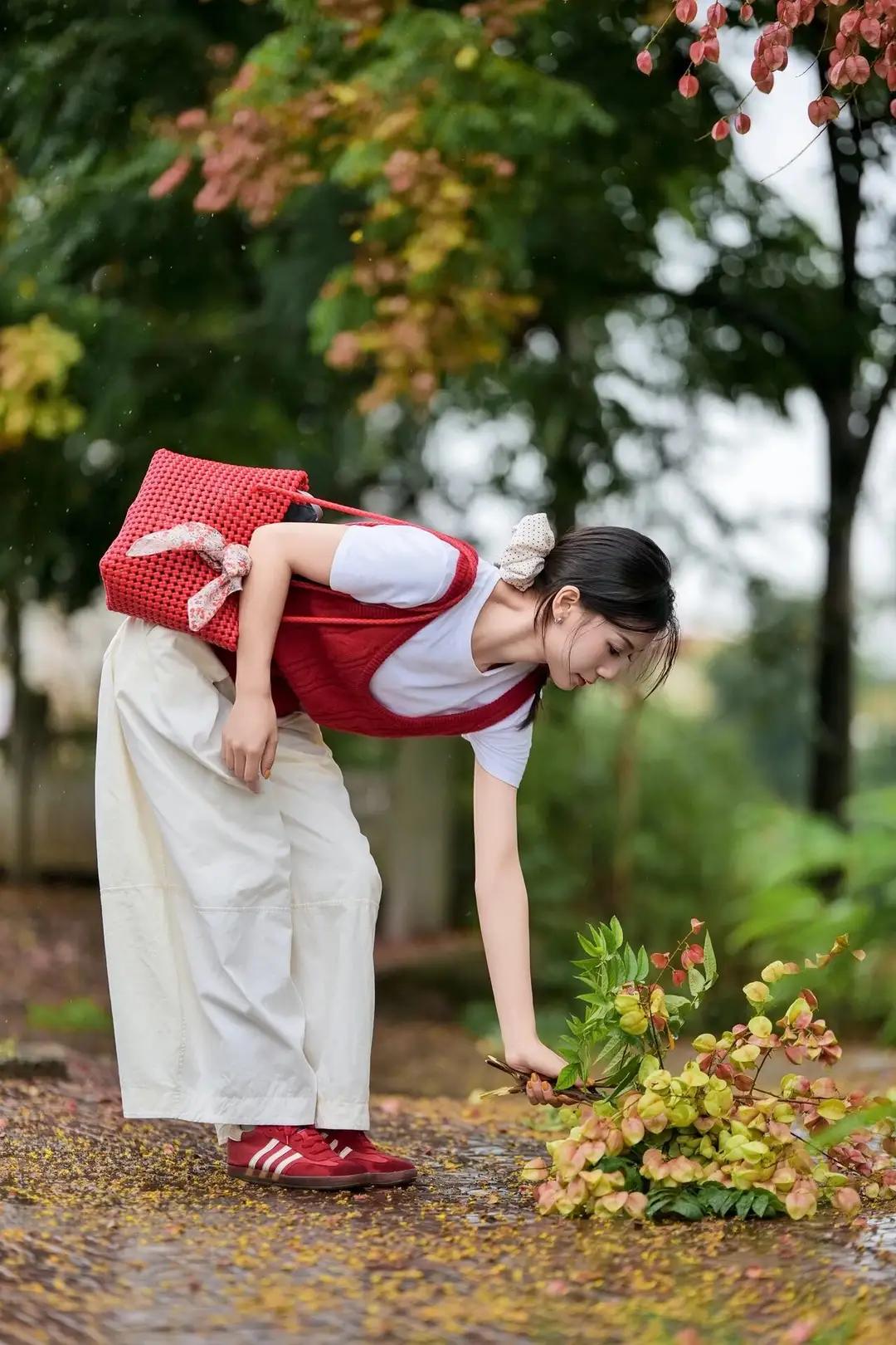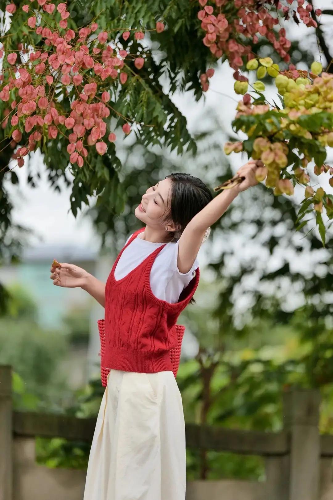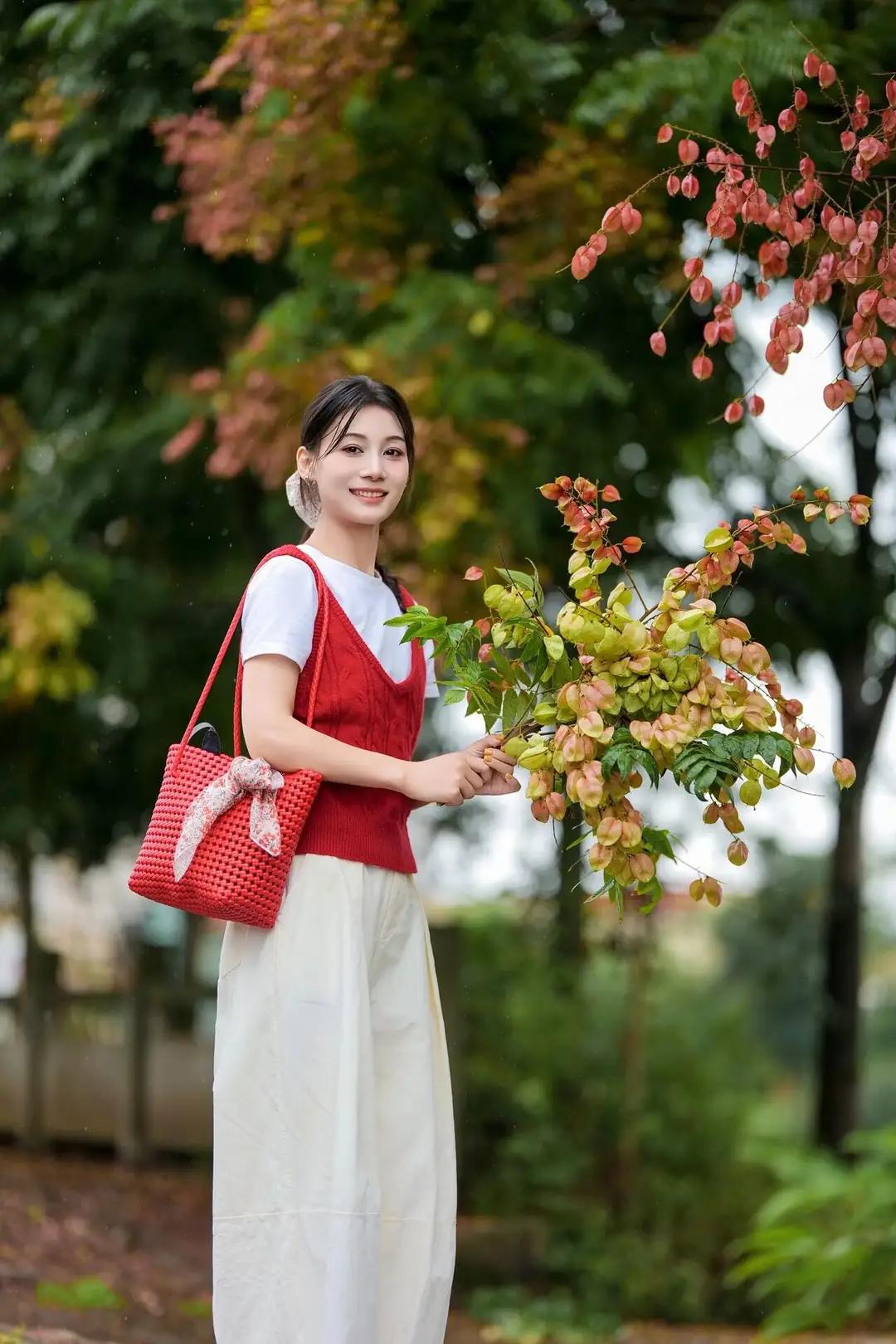 秋日清新优雅穿搭指南|秋日漫步,手捧红叶,感受自然的美好。