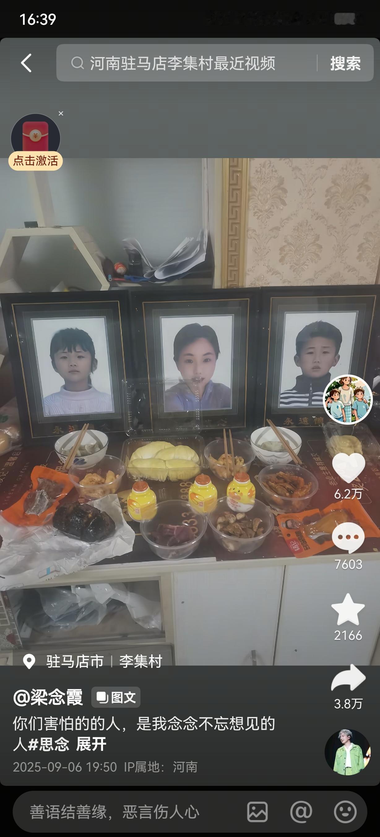 看了半天,才明白一个男人的抖音号为什么叫“梁念霞”?原来里面有一个他深爱着的叫“霞”的女子。 祭台上摆了很多东西,最引人注目的是塑料盒里装着的几块新鲜榴莲,想必榴莲是漂亮的妻子和孩子们生前最喜欢的水果。 曾经幸福的一家人因为轻信发小给了发小偷配家里钥匙的机会就导致了家破人亡,从此天人永隔。 希望梁先生坚持住,拼上余生也要为妻子儿女讨回公道!