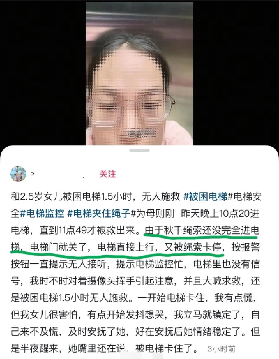 10月30日。深圳龙华某小区,女子发视频吐槽和2岁女儿被困电梯1.5小时,无人施救…… 而实际情况是:晚上10:20被困,11:49救出!救援时间1.5小时,并非1.5小时无人施救。而且被困原因是由女子所带的秋千绳索导致! 10月31日,该女子又发视频,说自己被网暴了。她表示自己仅仅是分享这么一个经历和当时的心情,不知道为什么会遭来无端的谩骂? 网友在评论区调侃这个女的:维权意识极强,安全意识淡薄! 不过,也有网友表示:一个半小时的救援时间确实有点太长了,作为一个母亲,在那种孤立无援的情况之下,发一个吐槽视频也是情有可原的! 各位看官,就这个事情,你有什么看法?
