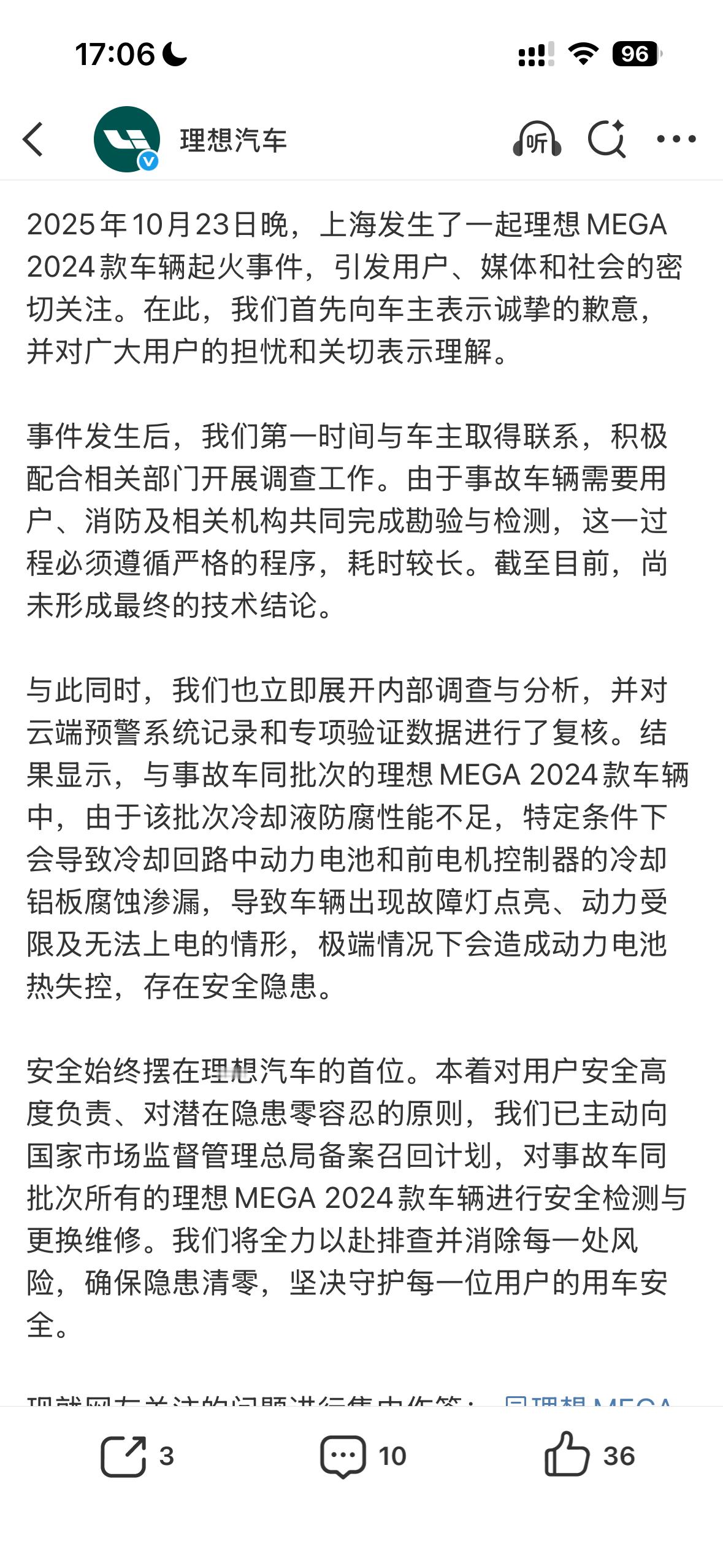 他不敢不重视。这个事情舆论太大。如果真的事缺陷引起的,如果再出一次。。理想得完蛋。。