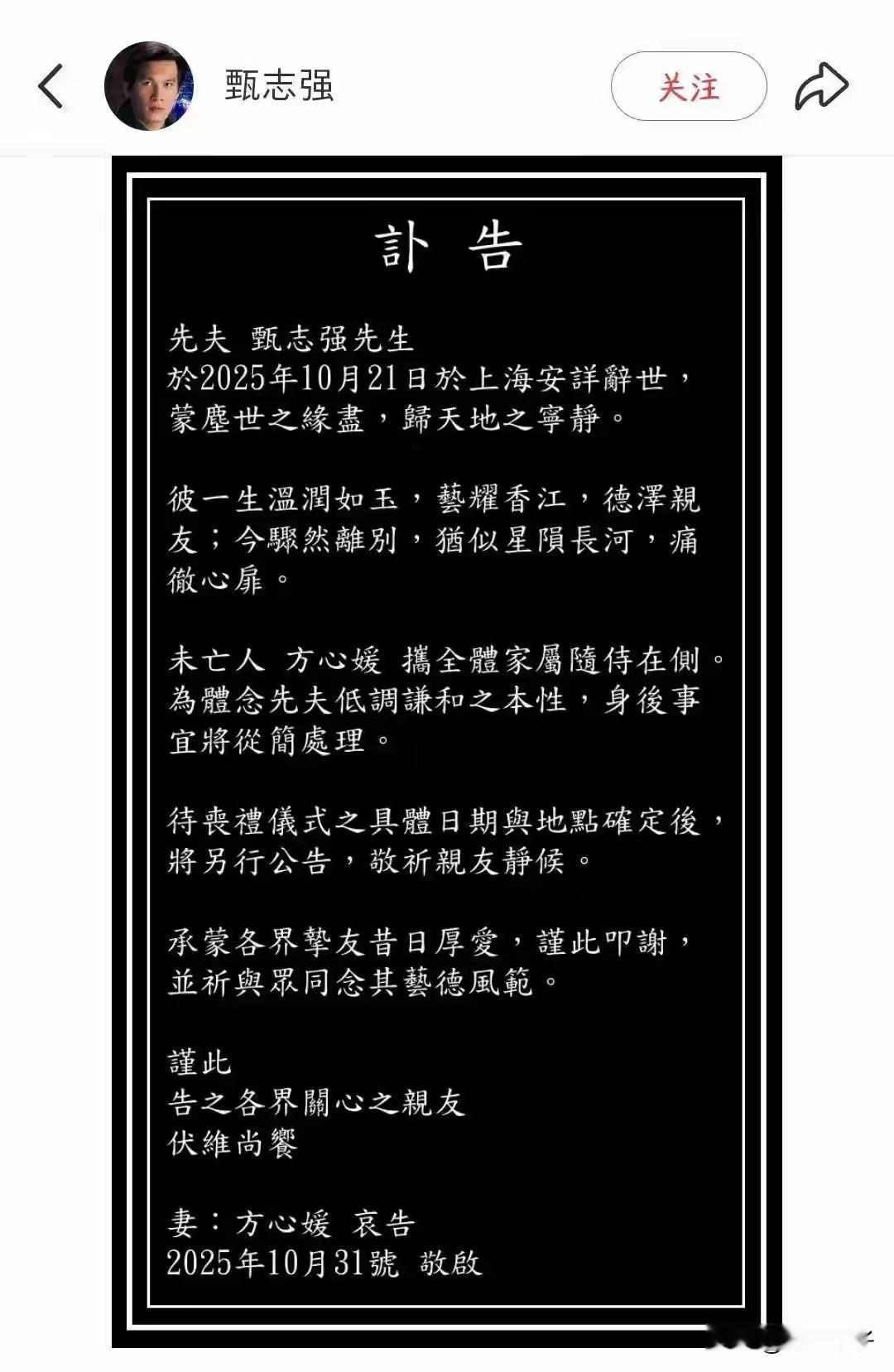 58岁的演员甄志强在上海辞世! 爱妻方心媛在社交平台发讣告。 被誉为“最美展昭”的演员甄志强, 饰《碧海青天杨家将》里的展昭, 给观众留下难以忘怀的印象, 虽然从模特转型进入影视圈, 没有红得发紫, 但他阳光、帅气、果敢, 扮演的个角色, 给人以正能量, 深受广大观众喜爱。 让人惋惜的是, 才58岁的他 就忽然撒手人寰, 还没有到退休年龄, 领取养老金呢 就这么匆匆与世界告别, 不得不感叹 这个世界有太多的未知, 明天和意外, 永远不知道哪个先来。 让我们珍惜当下, 珍惜眼前人吧, 好好享受生活, 见该见的人, 忘记所有不开心的事, 人生, 除了生死, 其他事都不是事。 甄志强去世