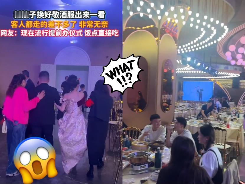 山东这新娘可太委屈啦! 刚换好敬酒服出来, 宾客竟 全吃完走了,那尴尬模样看着真让人心疼。原本婚礼顺顺当当,新娘满心期待着按老家规矩挨桌敬酒,跟亲友好好道谢。 结果呢,换个衣服的功夫,宴会厅都快没人了。有人调侃现在流行提前办仪式饭点直接吃,可这敬酒哪是简单走流程啊, 是新人对亲友的感谢和亲近。吃席吃的是人情,新人提前精心筹备,把大家当重要的人,咱花二十分钟等等敬酒,不也是礼尚往来嘛。 你们说,宾客提前吃完走,这合适不?
