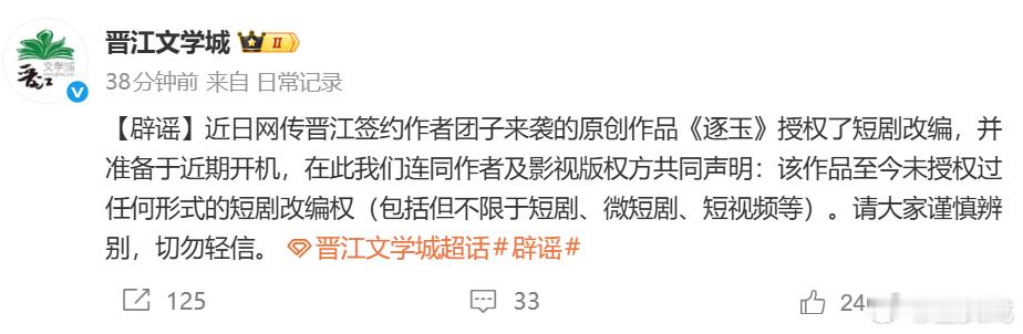 逐玉未授权短剧改编权晋江辟谣逐玉拍短剧 晋江发文:近日网传晋江签约作者团子来袭的原创作品《逐玉》授权了短剧改编,并准备于近期开机,在此我们连同作者及影视版权方共同声明:该作品至今未授权过任何形式的短剧改编权(包括但不限于短剧、微短剧、短视频等)。请大家谨慎辨别,切勿轻信。