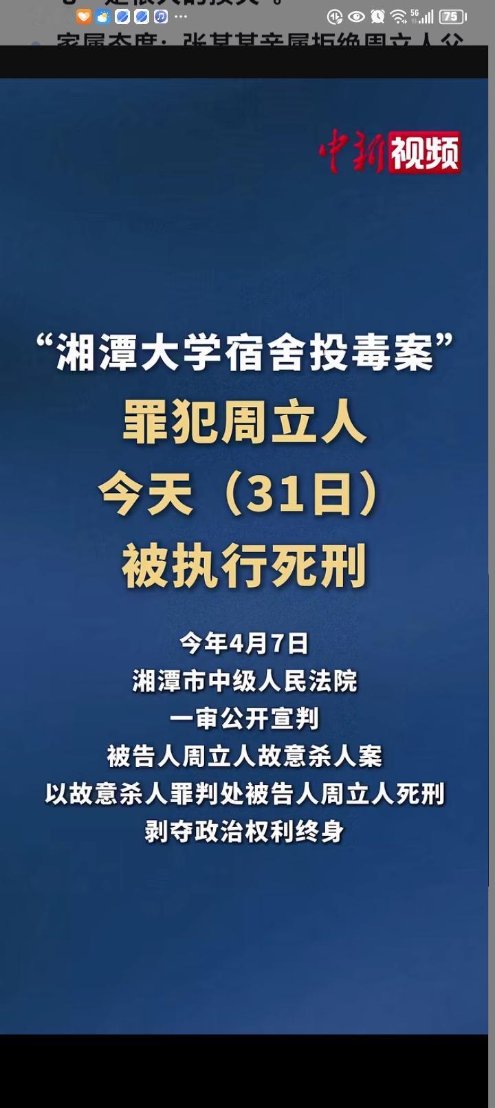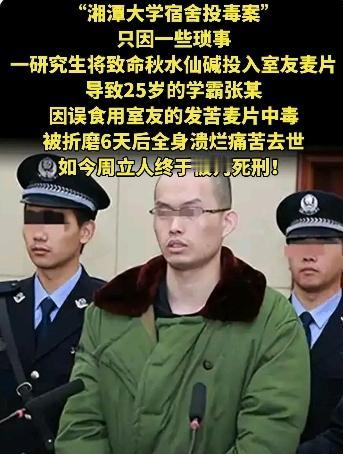 湘潭大学投毒案罪犯周立人今日被执行死刑 湘潭市中级人民法院门口布告前,人群沉默驻足。那张贴在墙上的布告,宣告了一场持续一年半的悲剧终于画上句号。 2025年10月31日上午,湘潭大学投毒案罪犯周立人被依法执行死刑。这场引发全国关注的校园悲剧,始于2023年室友间的琐事争执,终以一条生命的消逝和另一条生命的终结作为代价。 28岁的周立人曾是湘潭大学马克思主义学院硕士研究生。2024年4月3日,他向两名室友共食的罐装麦片内投放秋水仙碱粉末,导致室友张某某中毒身亡。 01 案件结局 最高人民法院于2025年9月28日依法核准判处罪犯周立人死刑,剥夺政治权利终身,并下达执行死刑命令。 湘潭市中级人民法院遵令,于2025年10月31日将罪犯周立人验明正身,押赴刑场,执行枪决。 案发至今一年半,这起引发社会广泛关注的校园投毒案终于走完全部司法程序,画上句号。 从一审、二审到最高人民法院的死刑核准,整个司法过程持续了近七个月时间。 02 悲剧酝酿 法院经审理查明,2023年6月,周立人被调入张某某等人居住的寝室。此后,周立人因琐事与张某某等室友多次发生争执,矛盾不断升级。 2024年1月,周立人从网上下载多篇涉及秋水仙碱的资料,并购买秋水仙碱粉末藏于寝室衣柜中。 案发前一个月,即2024年3月至4月,周立人与室友张某某、周某某的矛盾进一步激化,发生了多次激烈争吵。 案发当天,4月3日,周立人得知两位室友已向学校要求将其调出该寝室。这一消息成为压垮骆驼的最后一根稻草。 03 致命投毒 心生怨愤的周立人随即采取报复行动,向寝室内张某某、周某某共食的罐装麦片内投放秋水仙碱粉末。 四天后,4月7日,张某某食用了被投毒的麦片后,很快出现呕吐等中毒症状,并在同学陪同下前往医院就诊。 张某某的病情迅速恶化,4月9日晚转入重症监护室救治,4月10日下午被紧急转至长沙市中南大学湘雅医院重症监护室抢救。 尽管医护人员全力抢救,4月13日,张某某最终因急性秋水仙碱中毒致多器官系统功能衰竭而死亡。 04 庭审博弈 2025年1月9日,该案在湘潭市中级人民法院一审公开开庭审理。 在法庭上,被告人周立人当庭认罪认罚,承认网购并向麦片中投放秋水仙碱,但他辩称自己不是故意杀人。 周立人声称,投放秋水仙碱是为检测药性,为自己制作痛风药物。他解释,在被害人住院后多次否认投毒行为是因为害怕和恐惧。 公诉机关则指出,周立人大学本科在江西农业大学生物工程专业就读期间,在细胞学课程中学习到秋水仙碱的毒性。其利用所学专业知识投毒,建议以故意杀人罪判处周立人死刑。 05 司法程序 2025年4月7日,湘潭市中级人民法院对该案作出一审宣判,以故意杀人罪判处被告人周立人死刑,剥夺政治权利终身。 法院经审理认为,周立人为泄私愤,向寝室内两名室友共食的罐装麦片内投放剧毒物质,致张某某一人死亡。 周立人因日常琐事对室友不满,利用所学专业知识,趁机投毒,意图杀害两名室友,周某某因未食用而幸免。 在张某某毒发抢救期间,周立人刻意隐瞒事实,延误救治,终致张某某多器官系统功能衰竭身亡。 案发后,周立人还试图隐匿和销毁重要物证掩盖罪行、逃避惩罚。法院认定其“犯罪动机卑劣,主观恶性极深,社会影响恶劣,罪行极其严重”。 一审宣判后,周立人提出上诉。 2025年8月14日,湖南省高级人民法院二审宣判,依法裁定驳回上诉,维持原判。对周立人的死刑裁定依法报请最高人民法院核准。 秋水仙碱,一种原本用于治疗痛风的药物,成了周立人手中报复的工具。他本科在江西农业大学生物工程专业学习时,早已在细胞学课程中了解其毒性。 张某某的离世让一个家庭陷入无尽悲痛,而周立人的生命也在28岁这一年走到尽头。两张研究生录取通知书,曾经开启了两条充满希望的人生道路,最终却导向了一个双输的结局。大学宿舍投毒案 校园投毒案
