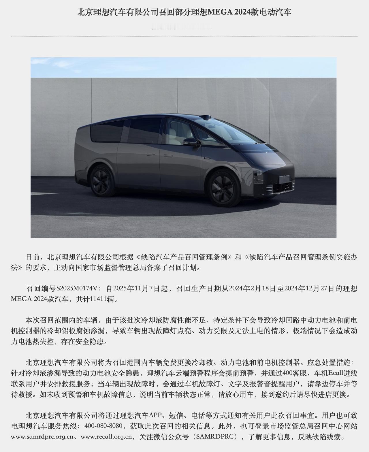今天国家市场监督管理总局缺陷产品召回技术中心发布的两则召回: 宾利飞驰及欧陆系列5台。起因,发动机高压燃油泵的固定螺栓可能未按照生产标准进行紧固,导致高压燃油泵松动,造成燃油泄漏。如果遇到明火将增加车辆起火的风险,存在安全隐患和排放危害。 理想MEGA 11411台。起因,该批次冷却液防腐性能不足,特定条件下会导致冷却回路中动力电池和前电机控制器的冷却铝板腐蚀渗漏,导致车辆出现故障灯点亮、动力受限及无法上电的情形,极端情况下会造成动力电池热失控,存在安全隐患。
