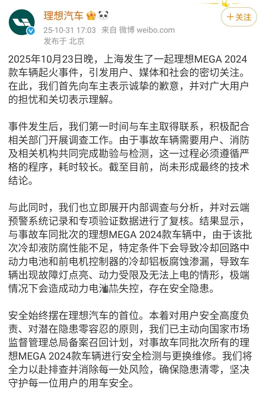 理想汽车宣布对理想MEGA进行召回!与上海一辆理想MEGA在行驶过程中突然出现爆燃有关! 本着对安全负责的原则,理想决定召回所有2024款的理想MEGA,涉及的车辆1万多辆,这些车辆都会将免费更换为全新的动力电池,防冻液以及前电机控制器。 按照销售数量以及成本计算,理想将为此次召回额外支付11亿人民币,不过理想的做法确实比其他的车企好是主动召回的,并不是受指令召回的。 相当于把一切潜在的安全风险都给彻底解决,电池也是全新的,这样就从根本上避免了发生问题的原因。 各位是怎么看的?欢迎评论区留言。