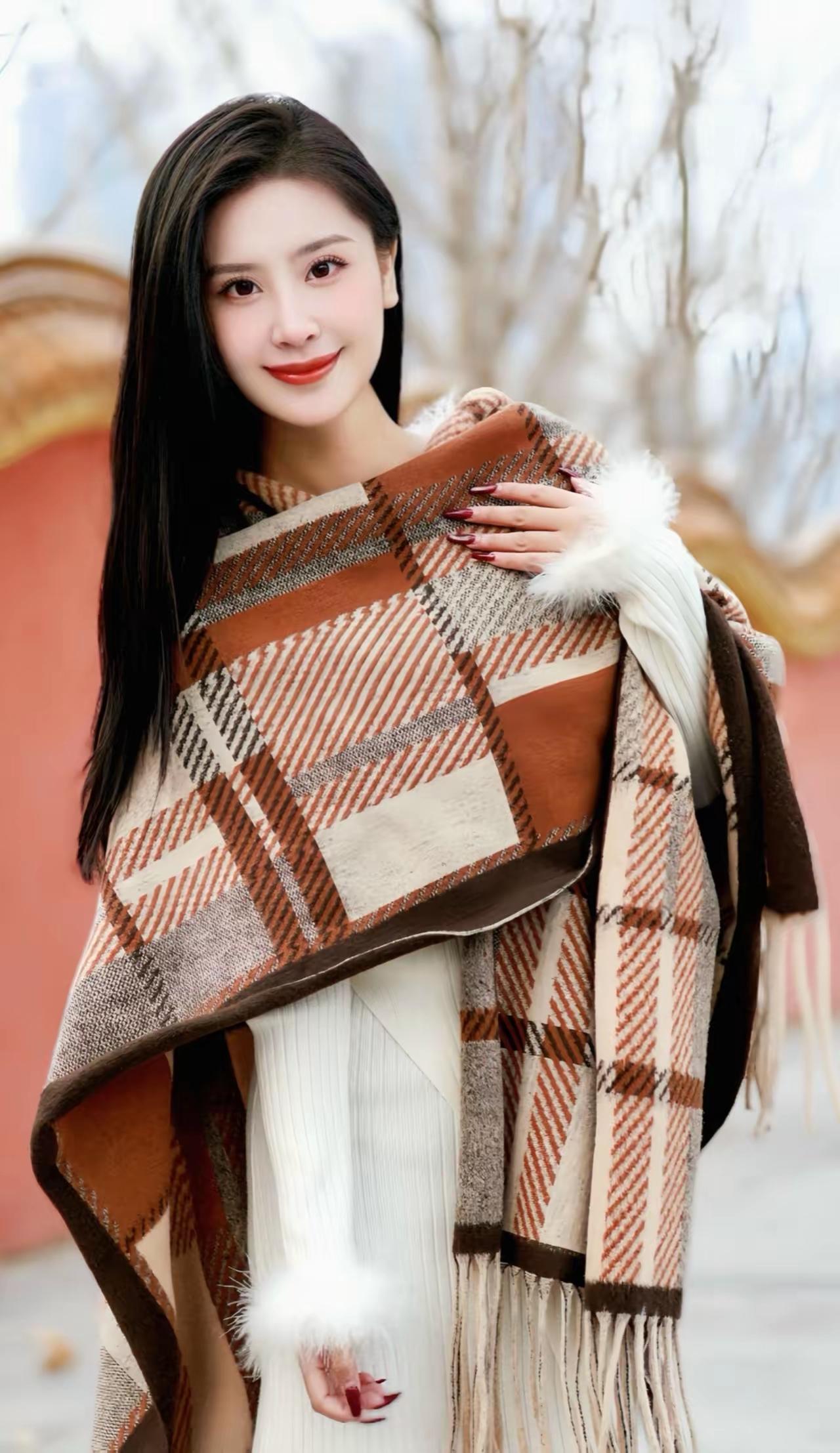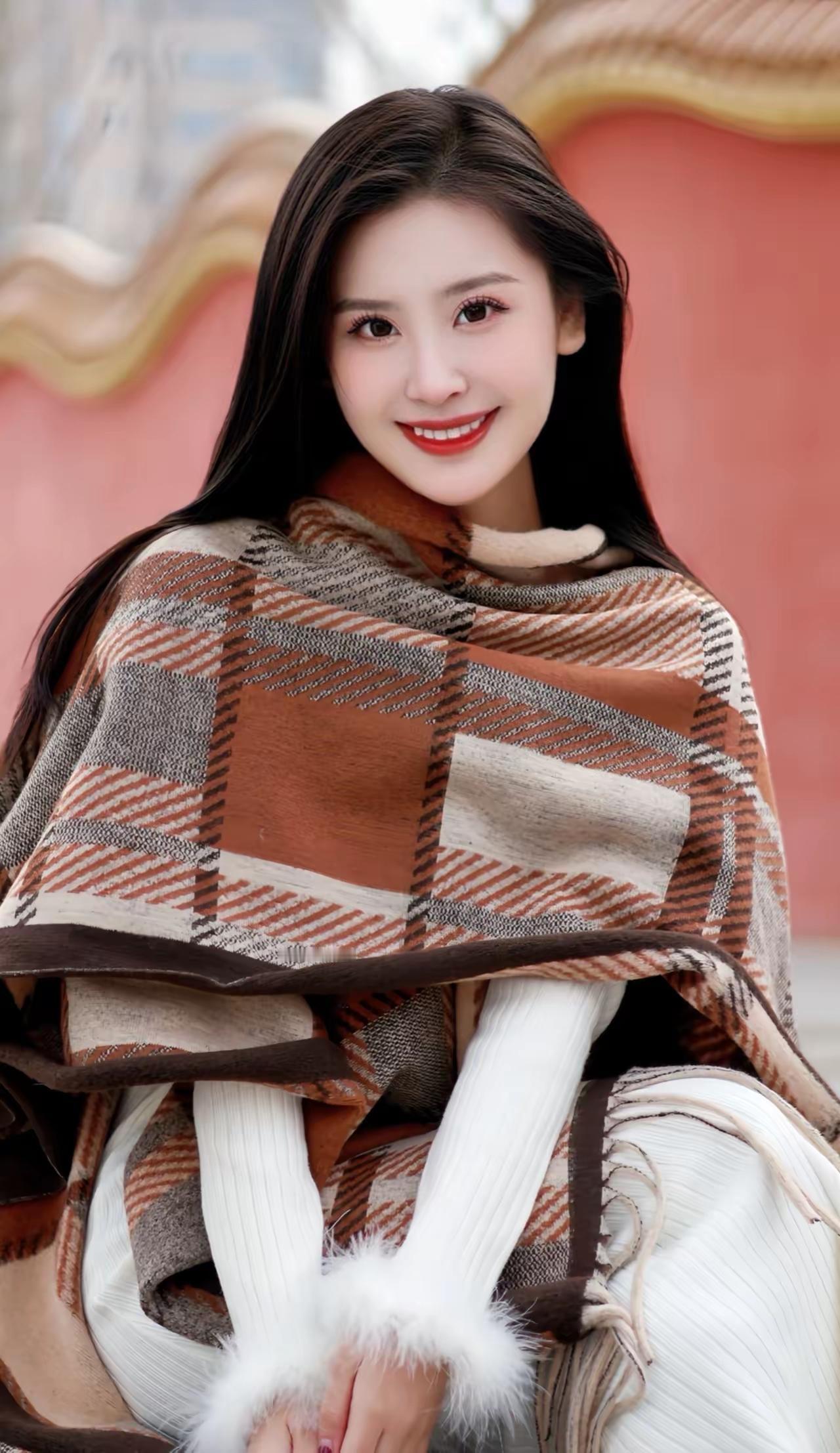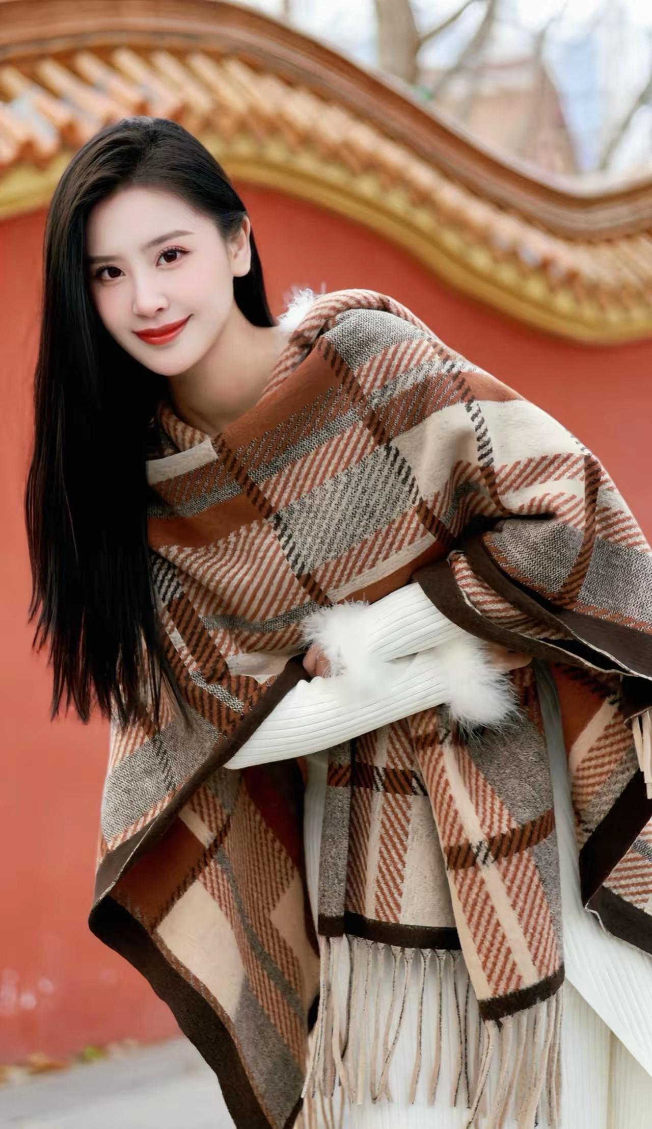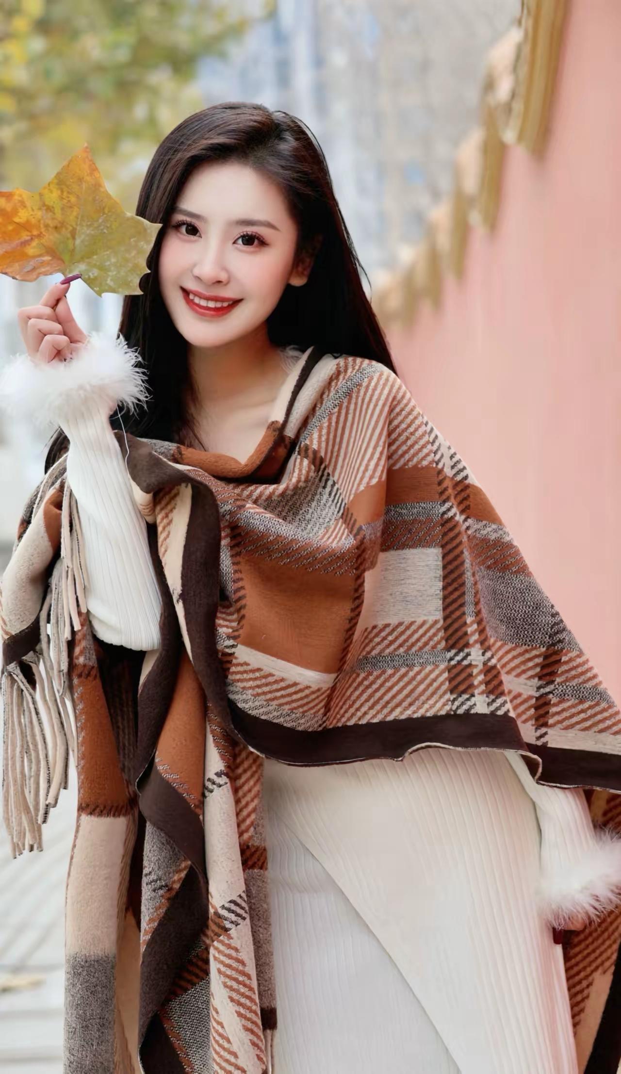 秋日暖阳下的甜美笑容,棕色格纹围巾与白色毛绒手套的完美搭配,尽显温柔与时尚。
