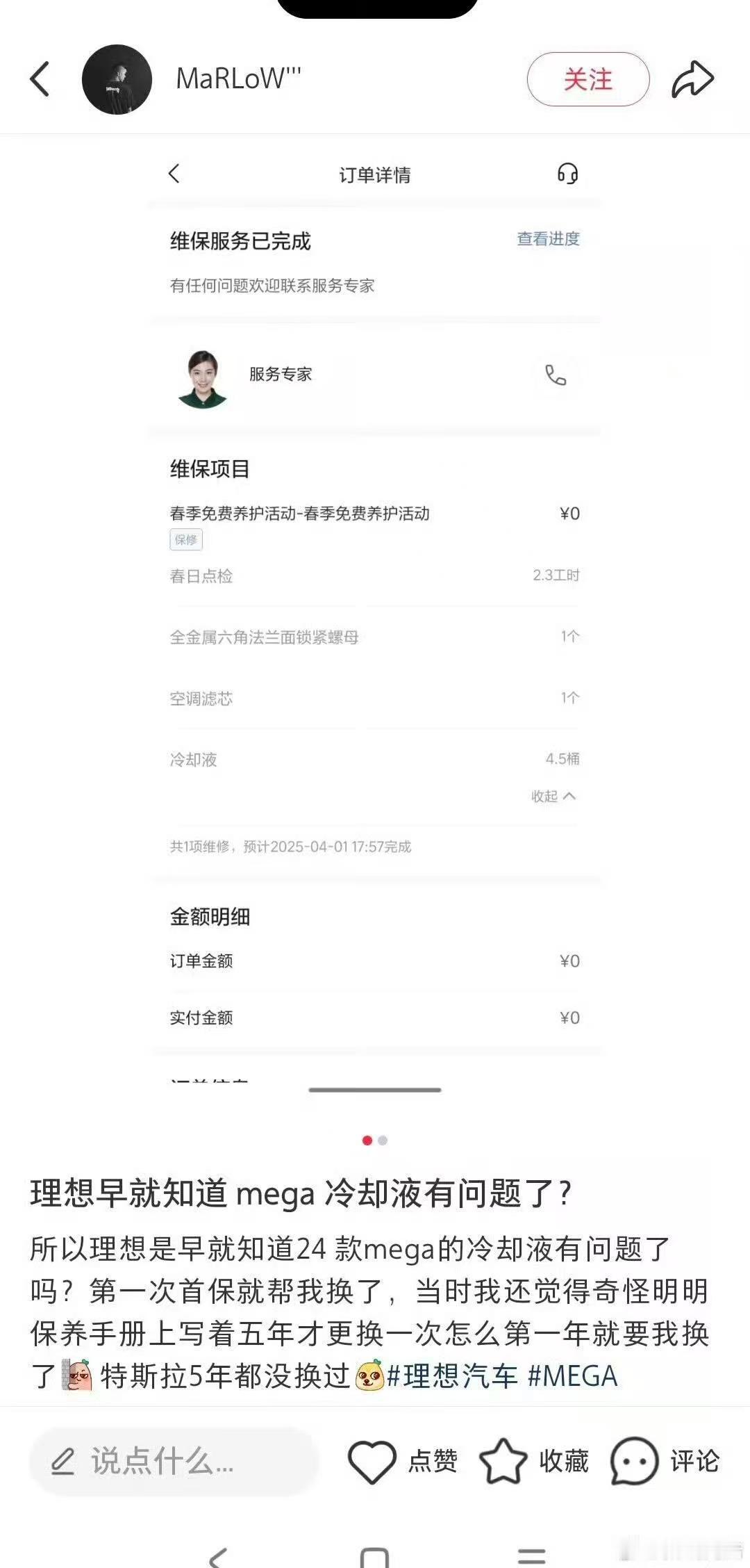 理想就车辆起火道歉小红薯有个博主说春季保养时就给新车更换了冷却液