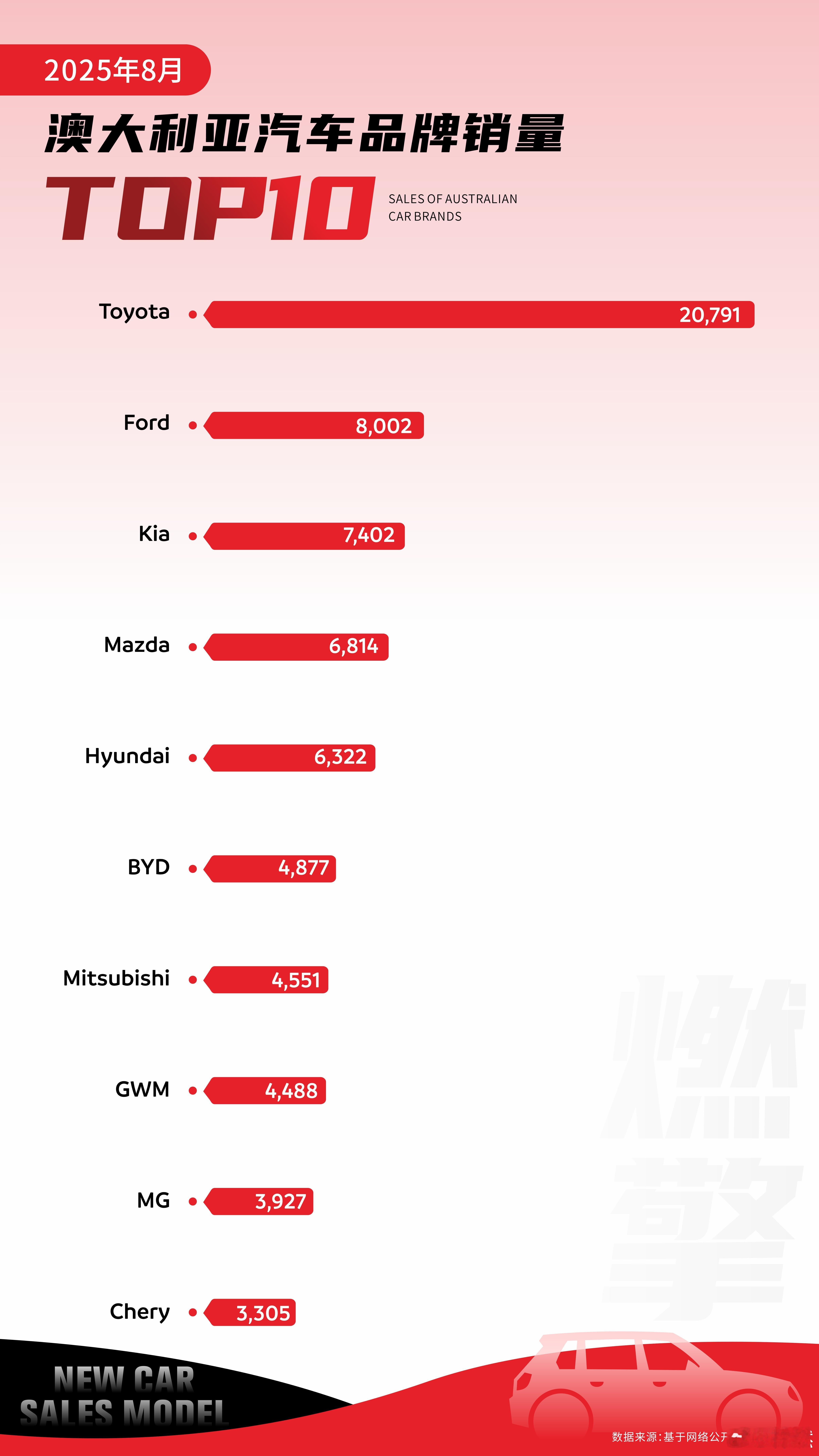 在榜单中,比亚迪是唯一一个以纯电动产品为核心跻身前列的品牌。其销量超越三菱等传统燃油车巨头,证明澳大利亚消费者对高端电动车的接受度正迅速提升,为中国品牌向上突破打开了窗口。