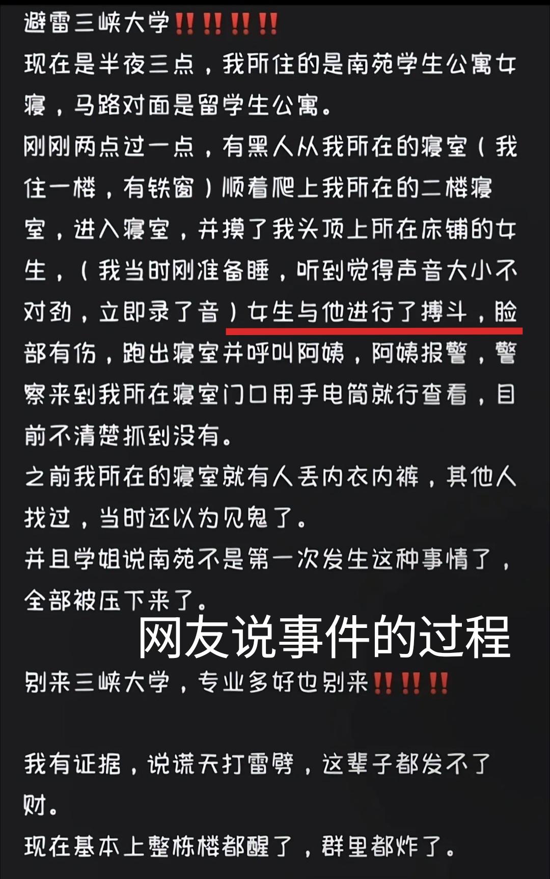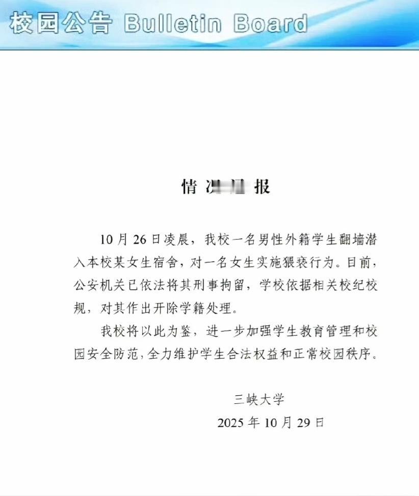 留学生擅闯女生宿舍,企图猥亵女生这事,三峡大学发了通报[赞]!10月25号凌晨时间,三峡大学一留学生,用手爬到女生的宿舍里,想对女生耍流氓[震惊]。 好在该女生拼命反抗,大声朝外面呼救,这才把对方吓跑了。随后女生选择了报警。可让人奇怪的是,事情刚过去的那几天,学校没有给正式通报,还解散了相关聊天群[笑哭]。 不过应该是在舆论压力下,29号三峡大学终于发了通报。通报上说,该留学生已被刑拘,开除了学籍[赞]。你对这事有什么看法?来评论区说下你的想法吧[灵光一闪]!