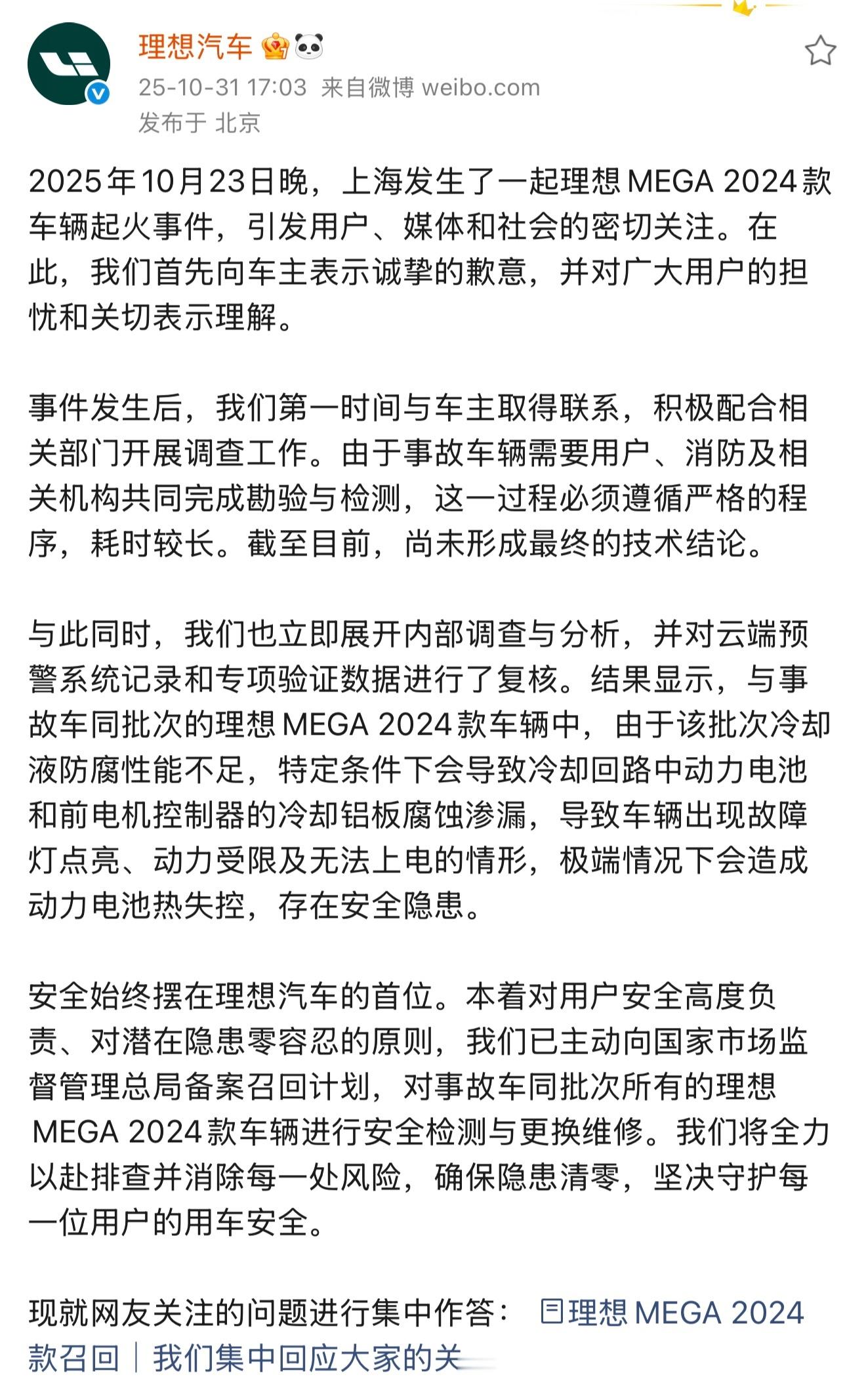 关于“MEGA2024款电动汽车部分召回”,理想态度诚恳、行动迅速,值得肯定。