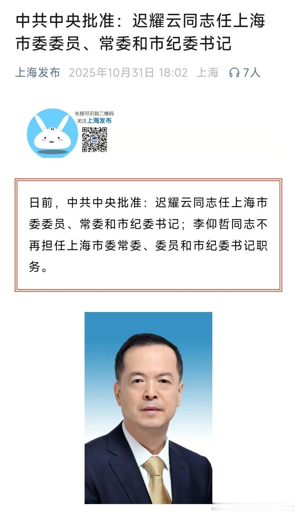 迟耀云任上海市委常委、市纪委书记。热点现场
