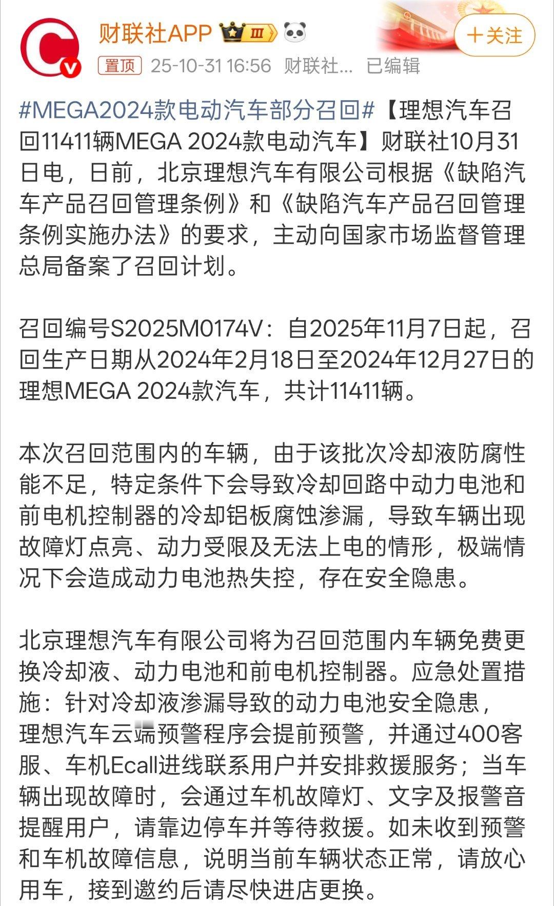 理想宣布召回2024年2月18日到2024年12月27日生产的全部MEGA2024款,共计11411辆,意味着去年生产的MEGA基本上都在召回范围之内,12月剩余的几天应该是没生产。