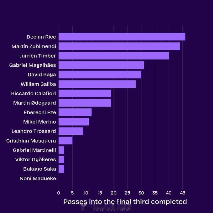 2025/26赛季,阿森纳球员在进攻三区完成传球次数一览表,赖斯&祖比门迪&廷伯排名前三 金秋观赛季 阿森纳著名教授