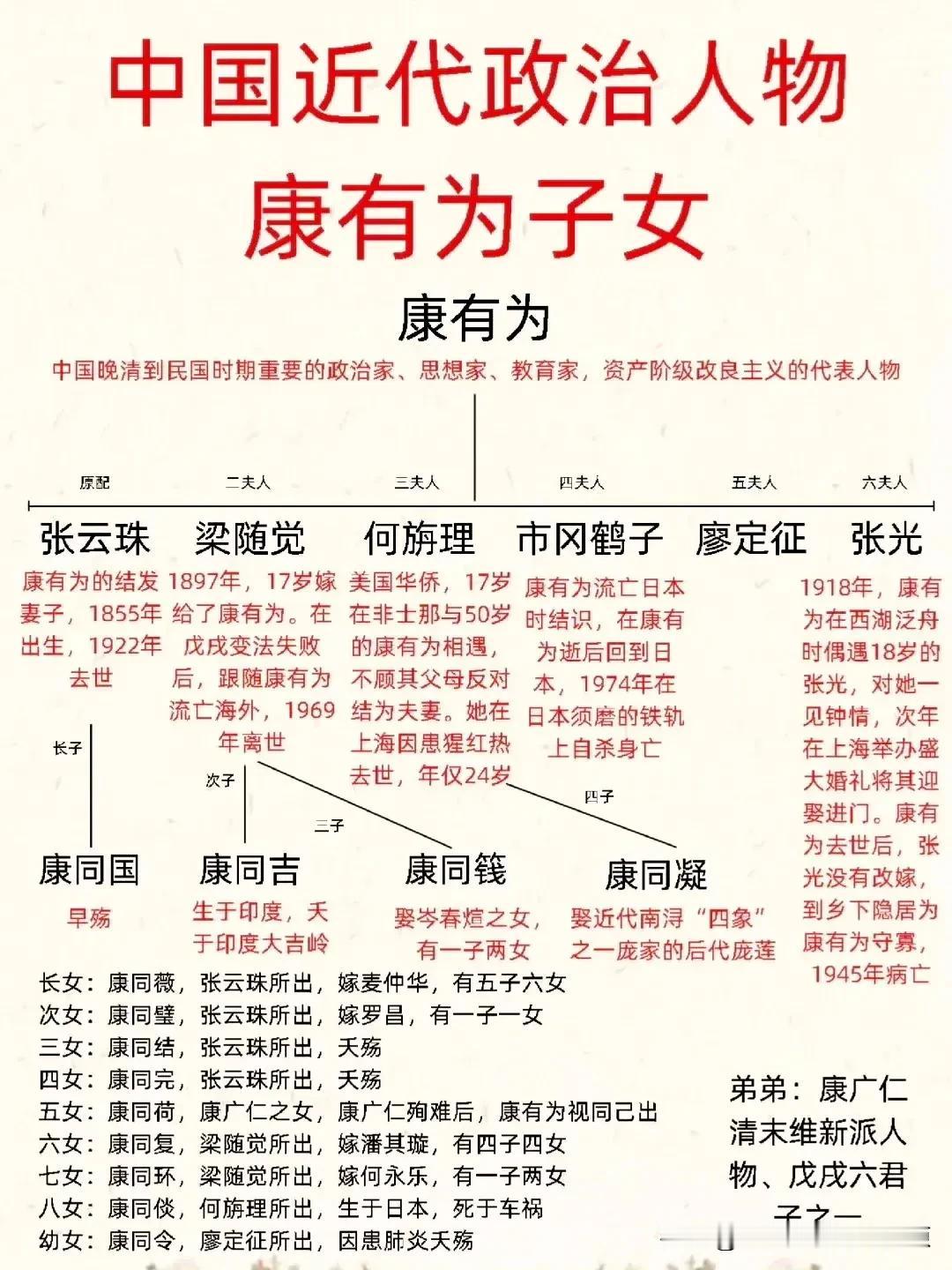 一个复杂的人物,他提倡一夫一妻制,可自己却娶了6个老婆, 结婚时年龄最大的也只有18岁。 戊戌变法失败后,这位先生就逃离了中国,他的弟弟可以说是替他上了刑场,是戊戌六君子中最冤的一位。 后来他活成了现在很多男人的梦想的样子 嘴上说着天下应当大同,所有人都应当一夫一妻。 可实际行动却是看见一个爱一个,娶了一个又一个。 在中国有老婆,跑到国外的时候又娶了外国人,当然还有中间的华侨女性。 最悲剧的是他六夫人张远。 本是18岁的大好年华,却不幸被这个已经头发花白61岁的老不羞看见。 被对方用银子砸,让军阀大佬去提亲, 身为寻常百姓人家,只能无奈妥协。 结婚当天非常隆重,可是唯独缺席了这老男人家里的前5位夫人包括他其他的孩子,都未参加。 深懂人心的老家伙,更是立下遗嘱将至第6位夫人牢牢困住,自己去世以后,所有遗产中所有字画都留给张光,但有一个附加条件,张光必须终生不嫁,如果她再婚,所有遗产立即收回,转赠给康氏宗族。 就这样,新婚8年后张光给他守了一辈子的活寡