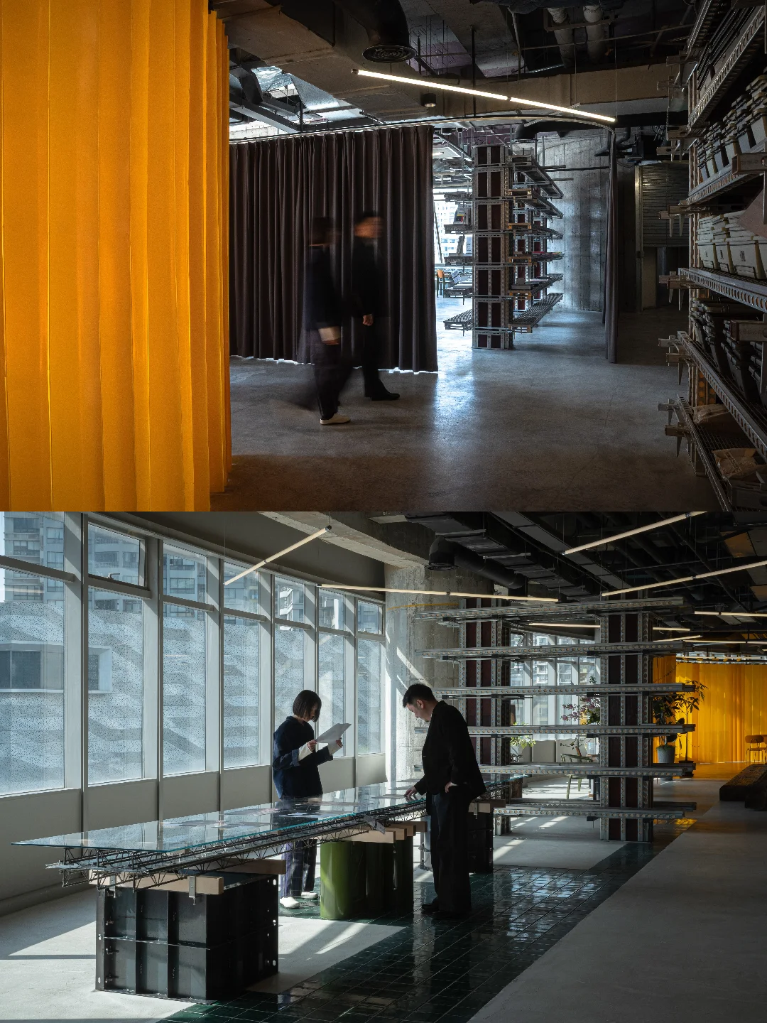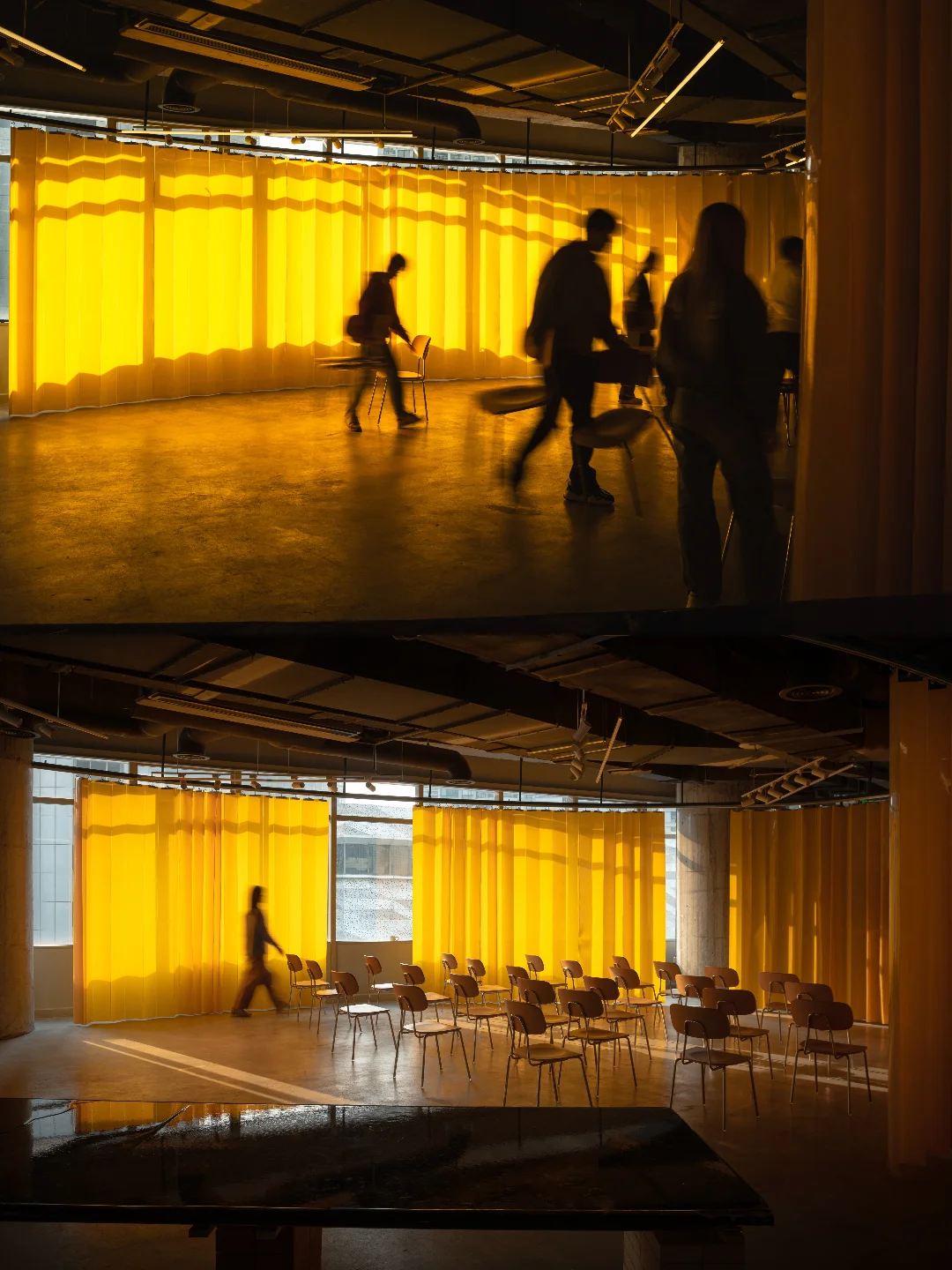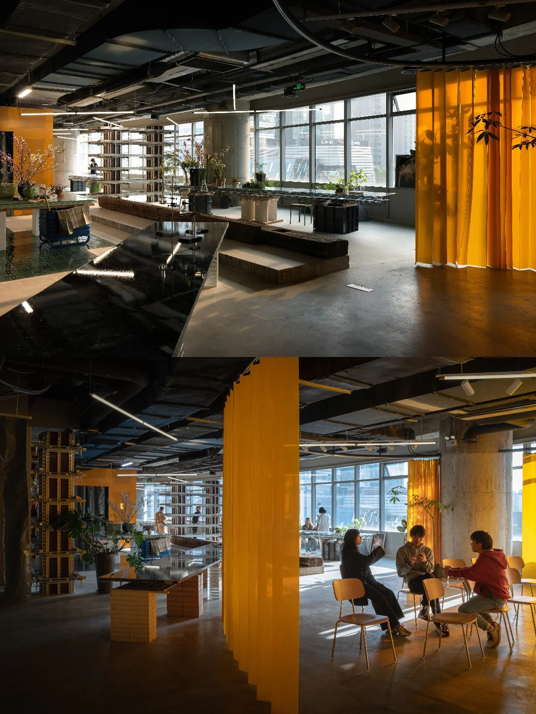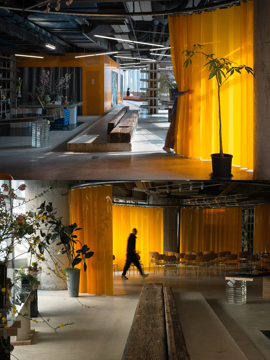 空间的入口透明的玻璃与充满盆栽的大阳台连为一体。以Cafe的空间开始,经过贴着橘红色的防火塑胶膜的隔间墙壁,两张长桌和展示架下的画廊和剧场空间,有着方形的园艺整理桌的花艺空间,一直到黄色的标志性帘子围成的演讲,分享的区域。