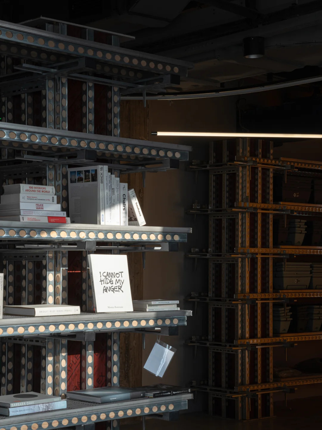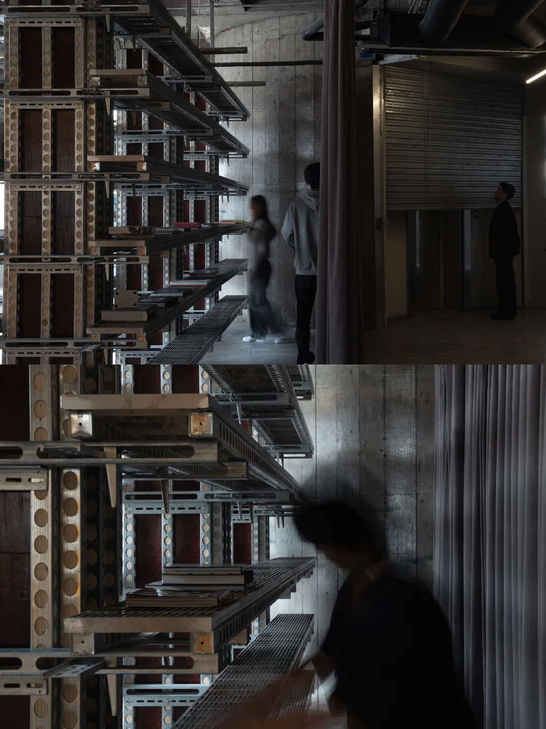 再到最里面经过灰色帘子,停步在巨大书架组成的图书馆空间。整个空间没有断然的界限,彼此流动呼吸。