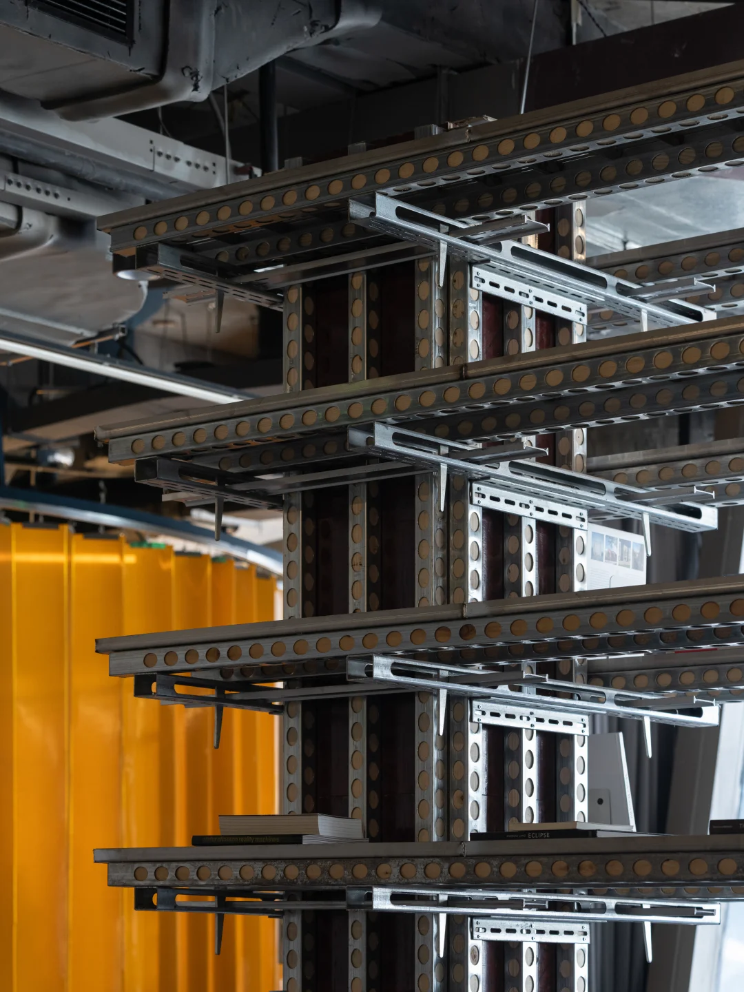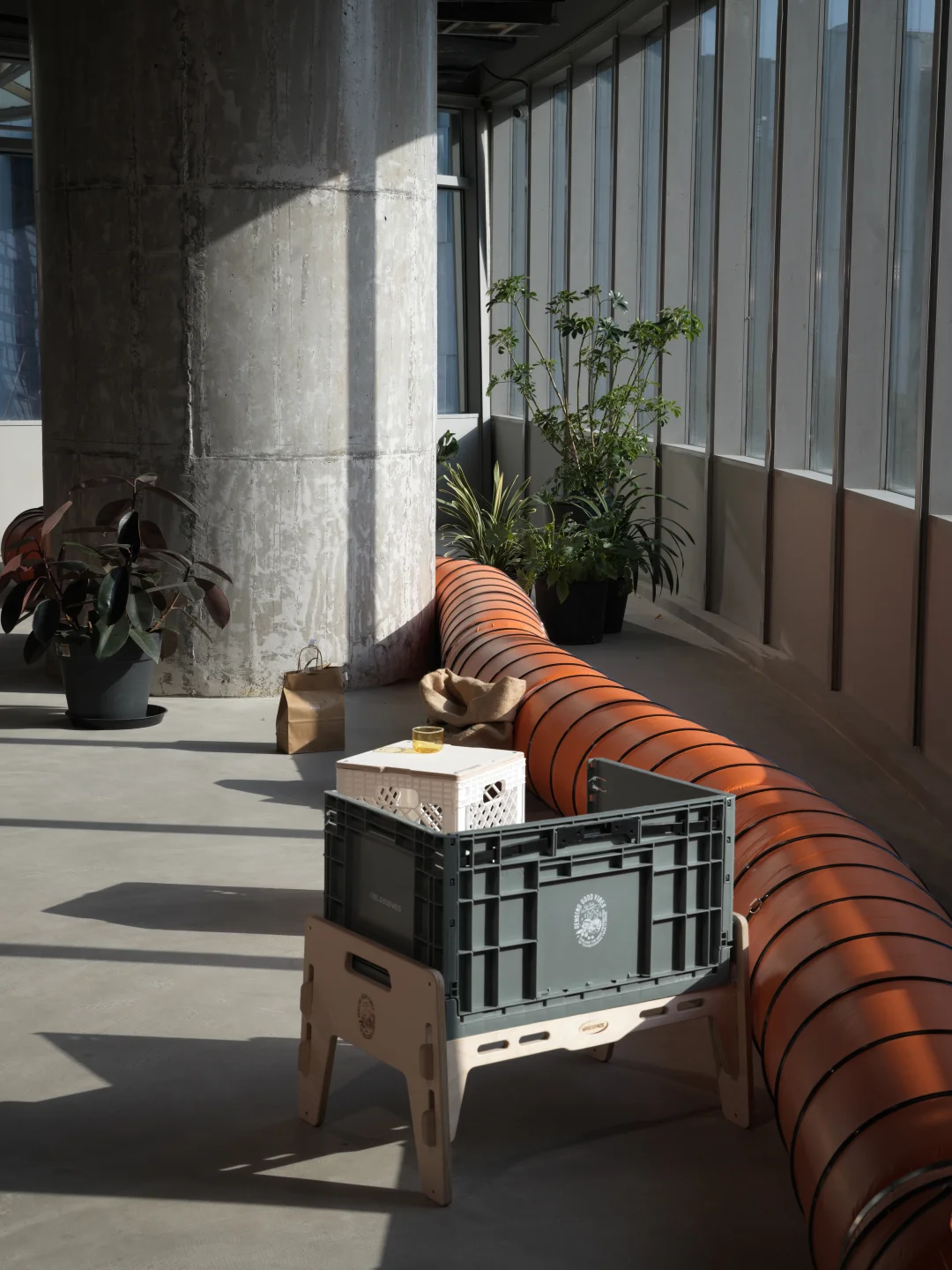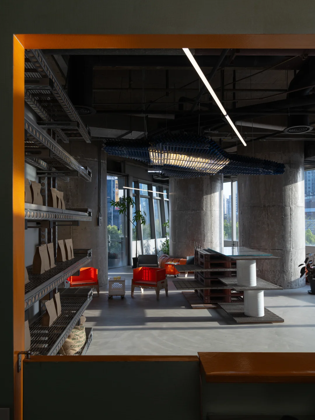 谱观将一座商场变成一处探讨“消费社会”的实验室。在889GLO,构成空间的不再是木作或玻璃,而是混凝土模板、物流叉车托板、工业金属油桶与防火通风管道等。贴上墙的防火塑料薄膜让空间充满橘红色,这种色彩不是设计者的刻意而为,而是防火要求下现成品具备的材料本色。这些物件被赋予着新的秩序,也唤醒我们对于物质世界背后逻辑的反思。