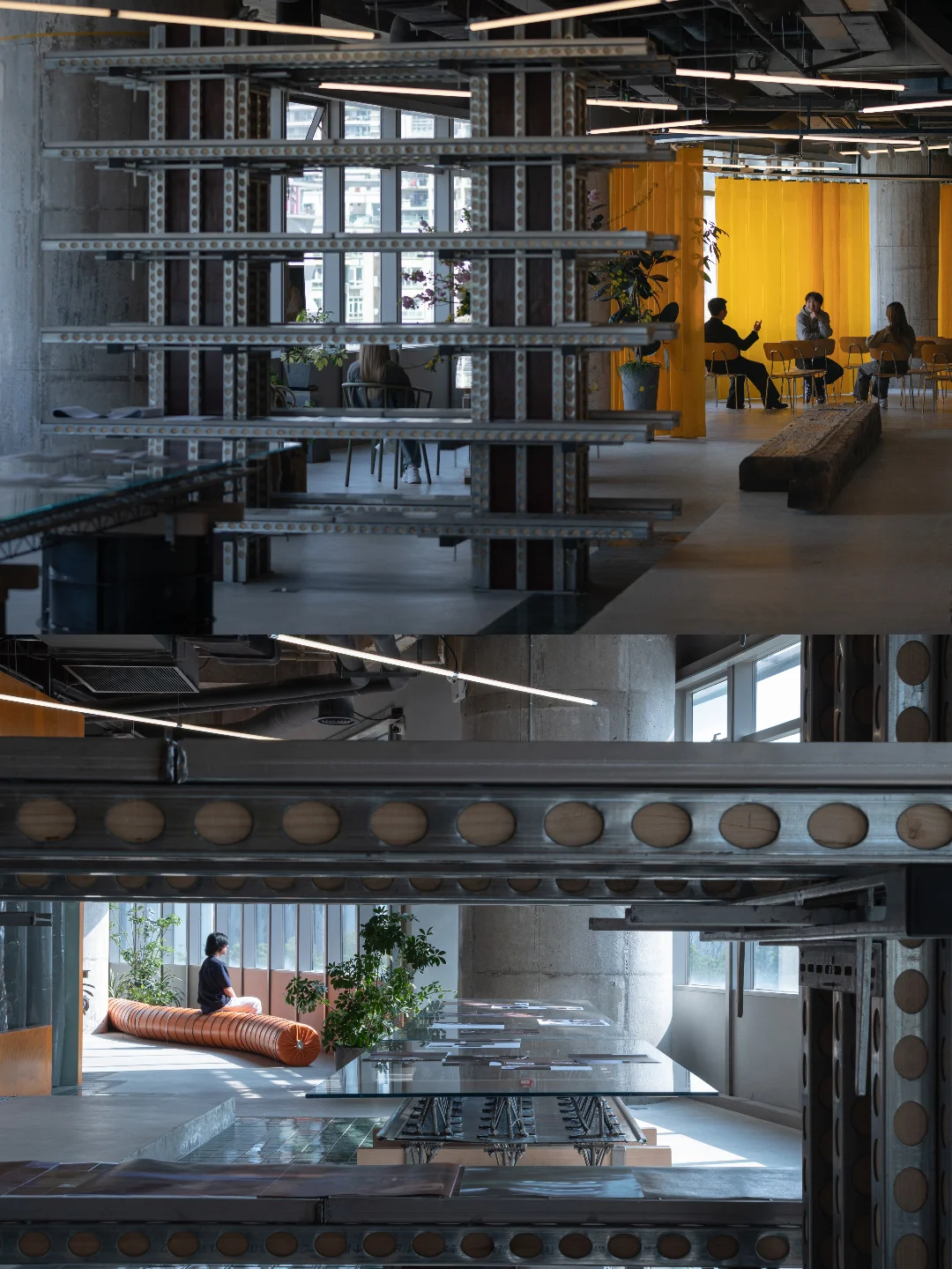构想中的889GLO是一个集图书馆,生活方式,艺术分享与展示为一体的新型文化空间。之前不同租户各自粉刷的天花板色彩和原本吊顶里无粉刷的混凝土一起保留下来。