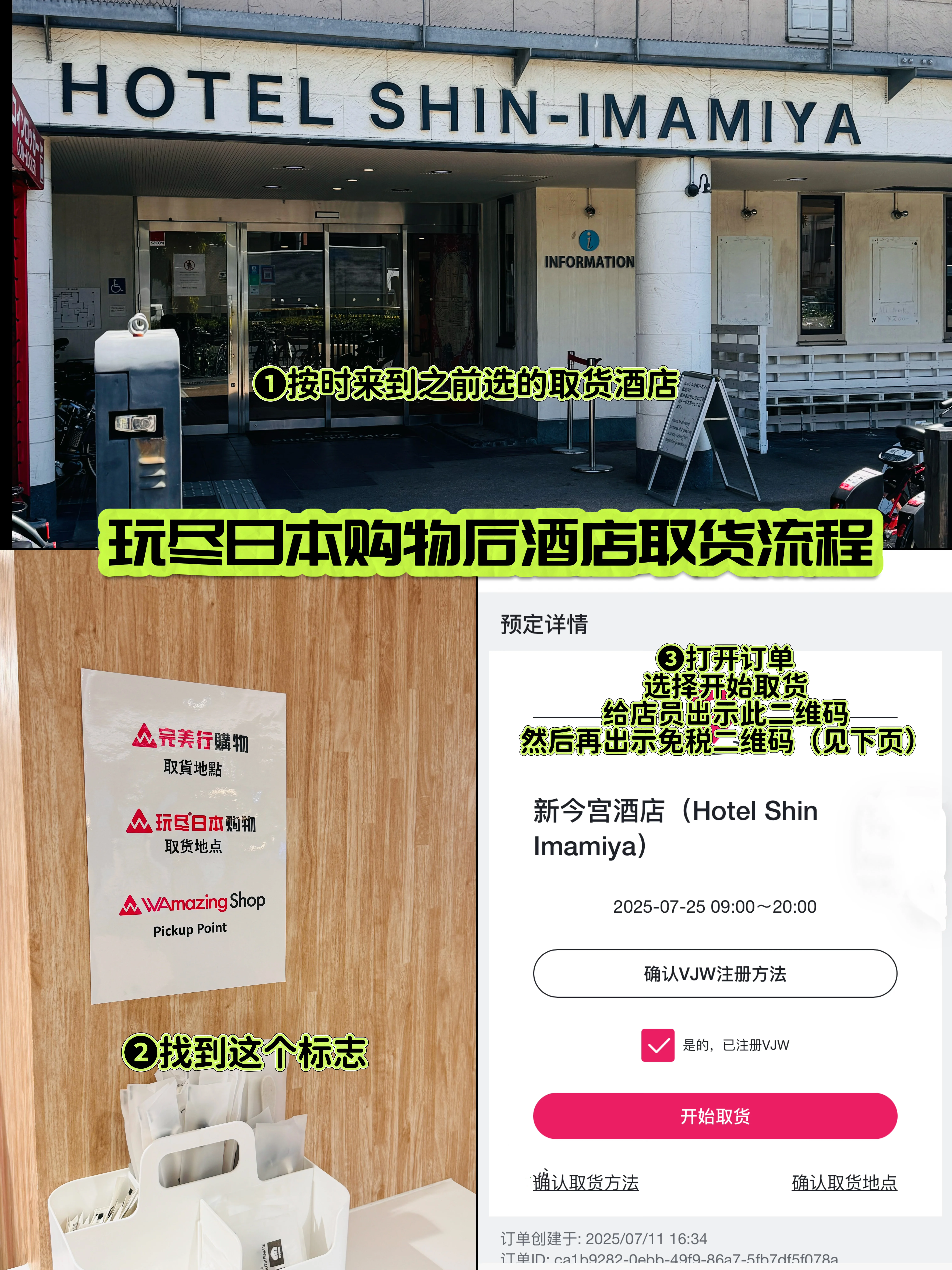 ❸按预订日期到达取货酒店。取货时需要用到两个码:1.先找到自己的订单,选择「开始取货」即可获得订单取货码 2.再打开VJW的免税处生成实时免税二维码,出示后扫描完成即可完成取货