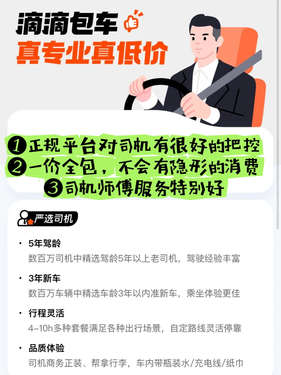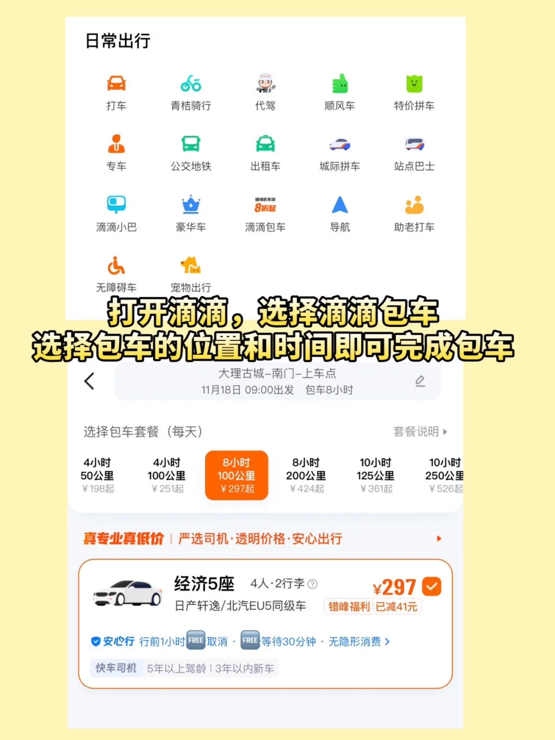 滴滴A.p.p上选择更多服务,滴滴包车!进入页面选择时间、地点和包车的时间和公里数即可完成预约!如果有优惠券记得领券哦!