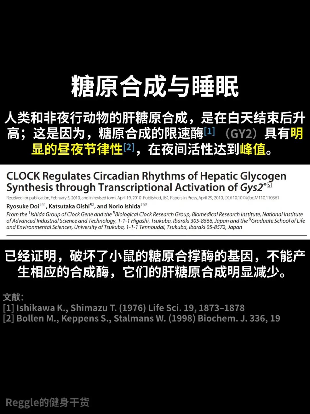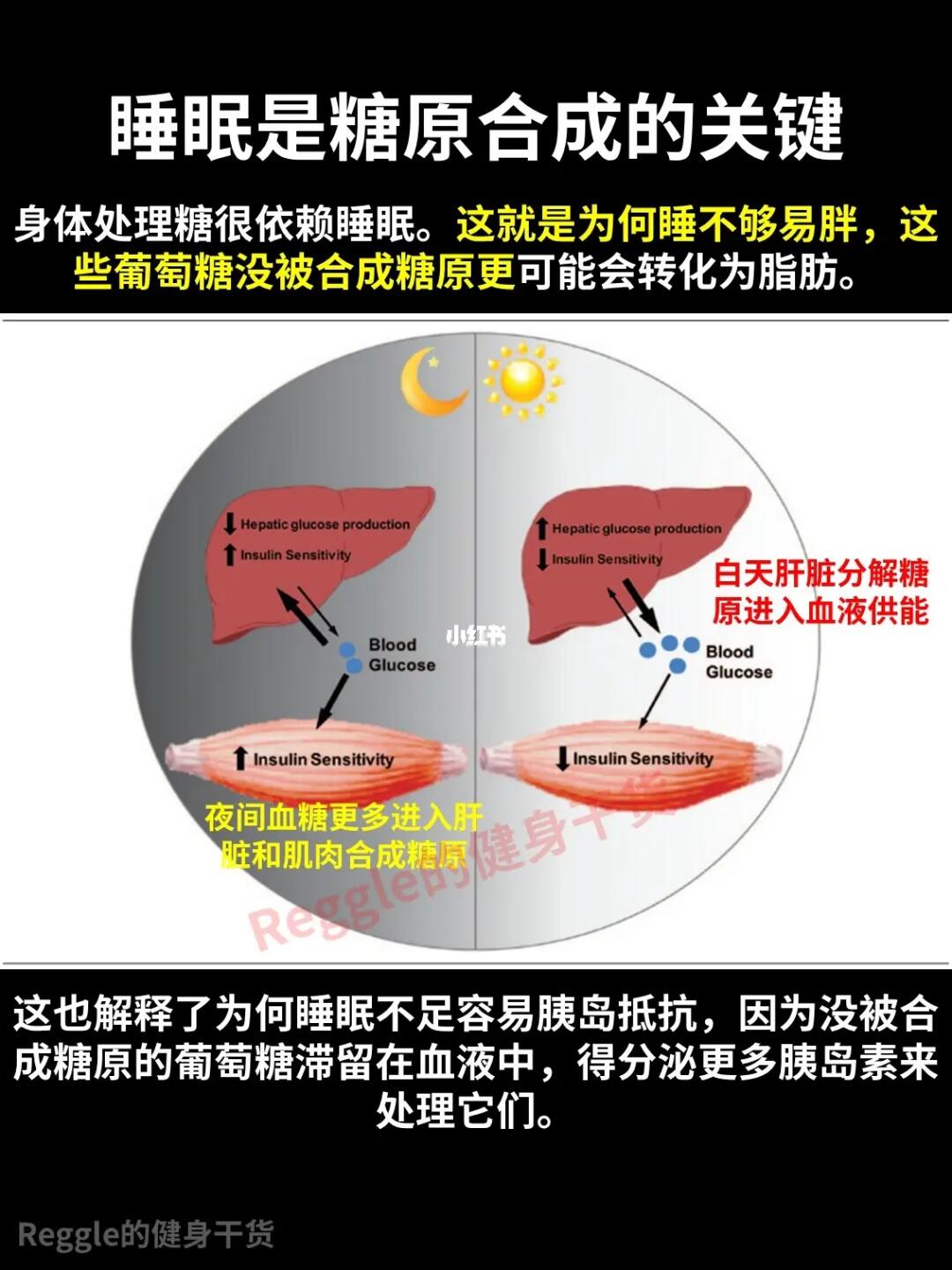 3. 肝糖原和肌糖原的合成受生物钟的调节,糖原合成限速酶(GY2)具有明显的昼夜节律性,睡得好,碳水合成糖原多、转化脂肪少;