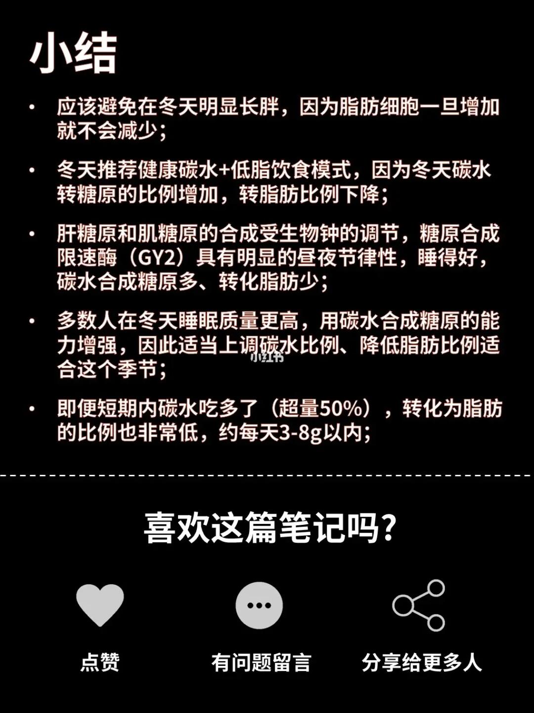 2. 推荐冬天高碳水+低脂饮食模式,因为冬天碳水转糖原的比例增加,转脂肪比例下降;