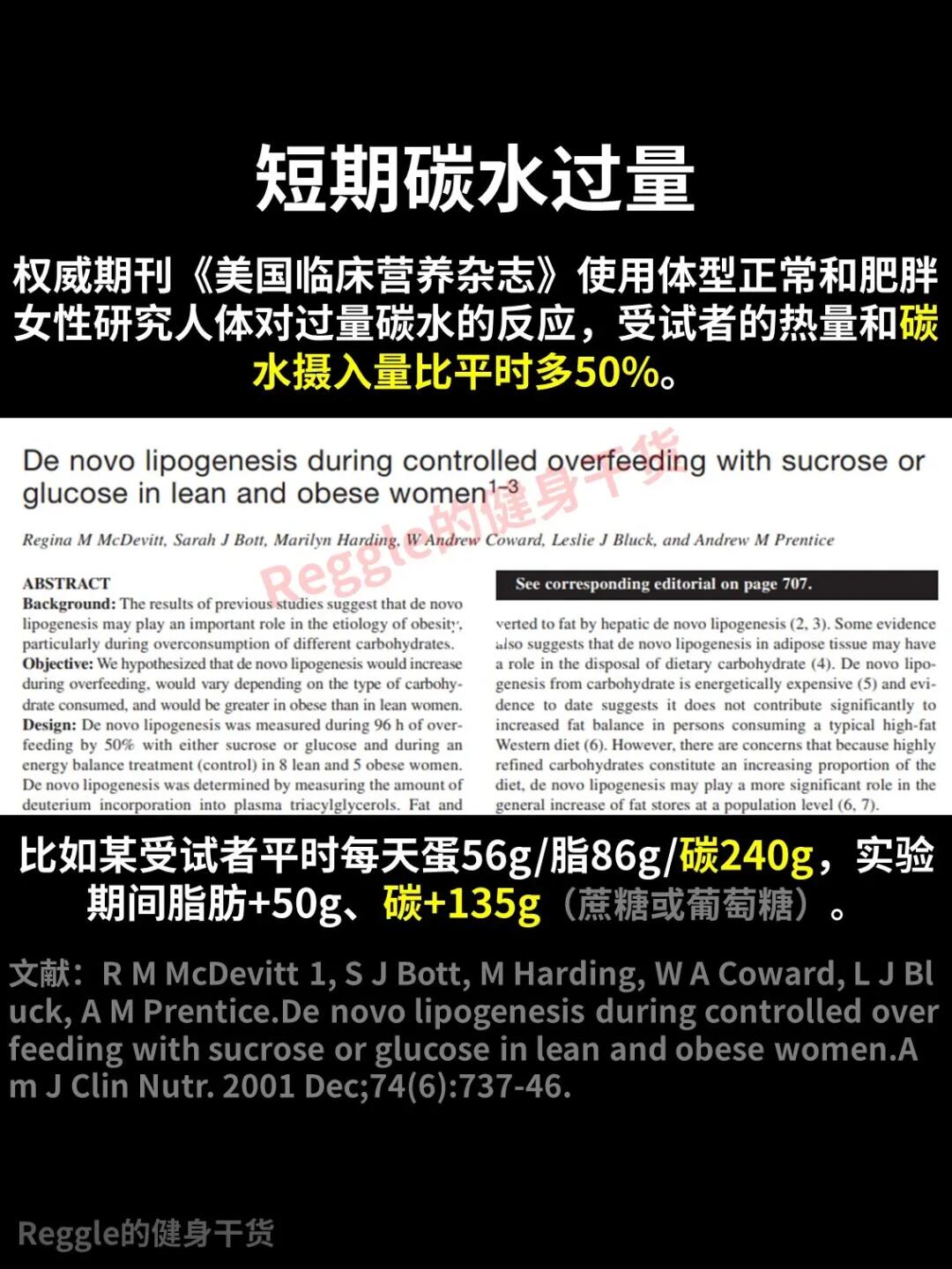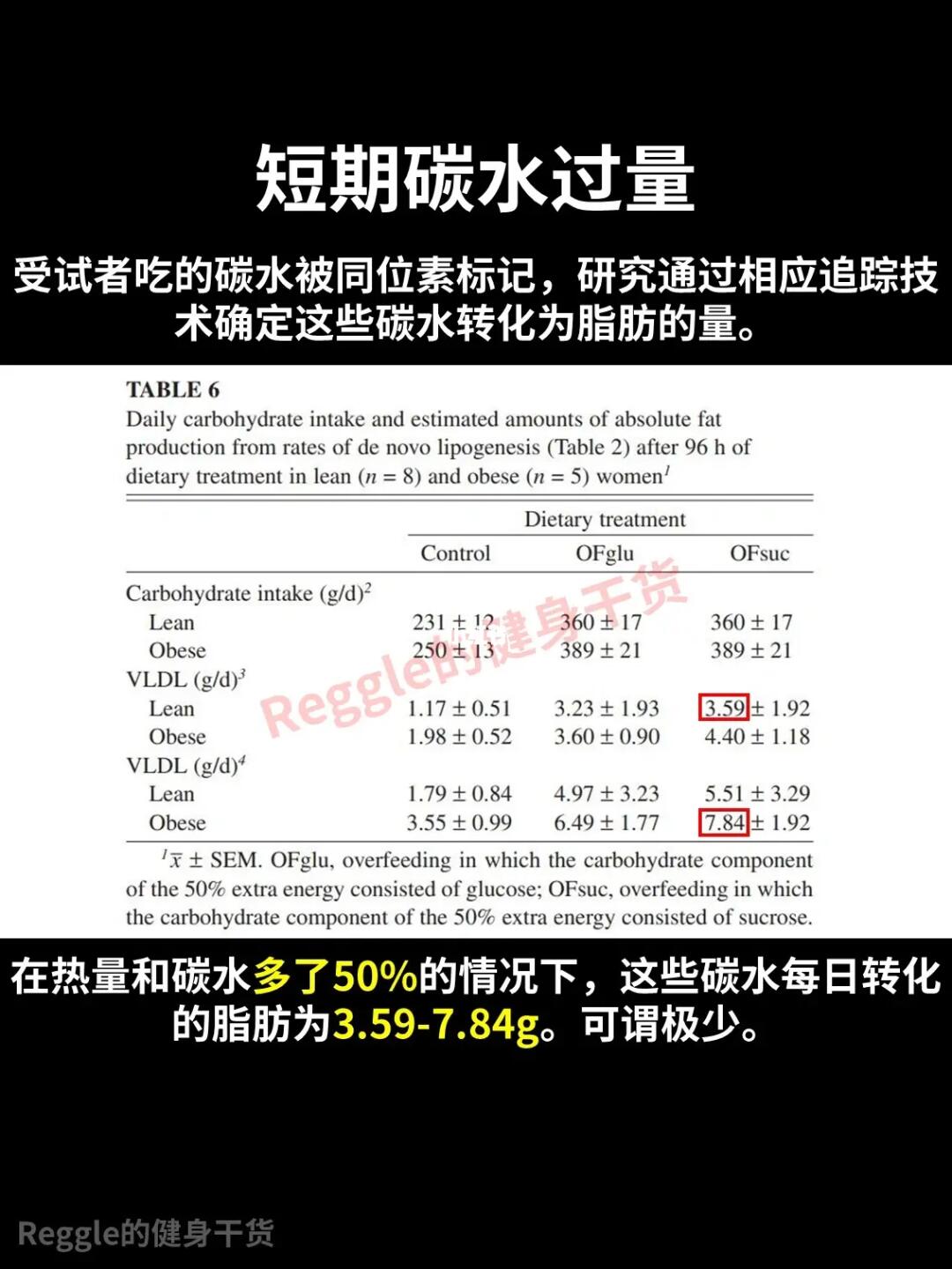 6. 权威期刊《美国临床营养杂志》发表的研究表明,短期内(96小时)每日碳水超量50%,这些碳水转化的脂肪仅3.6-7.8g/天。