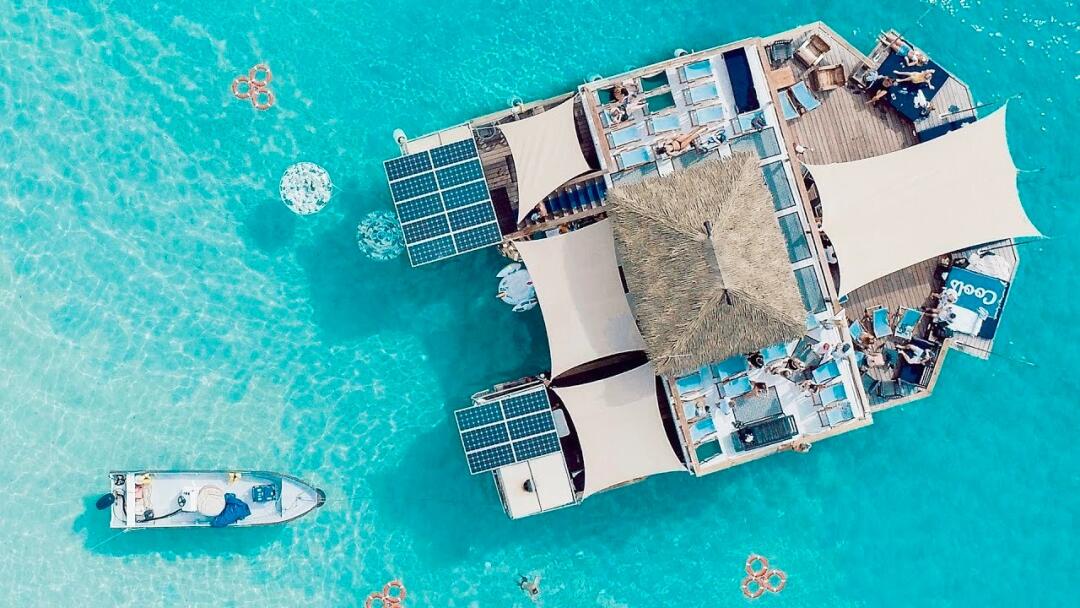 来到斐济唯一一座水上漂浮酒吧。一座双层浮台,一层有餐厅,二层可以晒太阳或从栏杆一跃而下跳入海中