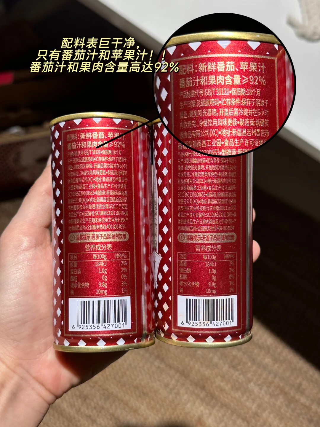 看配料表特干净,就番茄汁和苹果汁,没加糖没加水,全是天然味儿。新疆番茄的番茄红素丰富 ,多吃可以提亮肌肤~