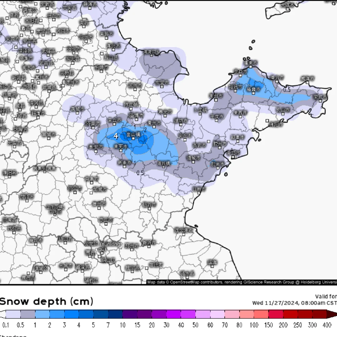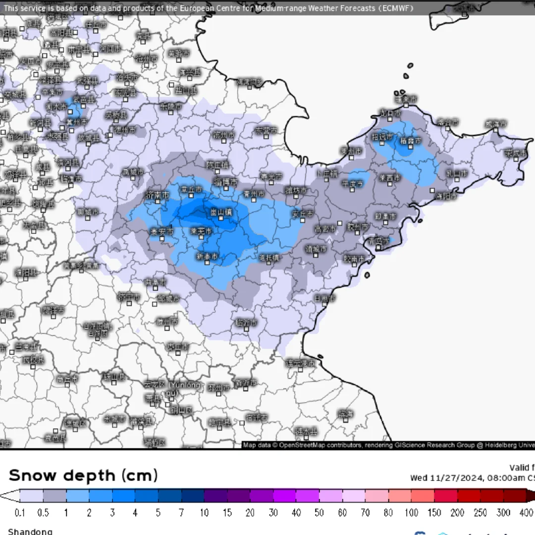 通过数值预报的最新数据来看,鲁西北、鲁中北部和半岛一带降雪概率更大,省会济南也可能在泰山西北风迎风坡的效应下,更有利于出现降雪。此外,27~28日半岛东部地区的冷流雪概率很大,烟台、威海的丘陵山地很容易出现明显积雪。