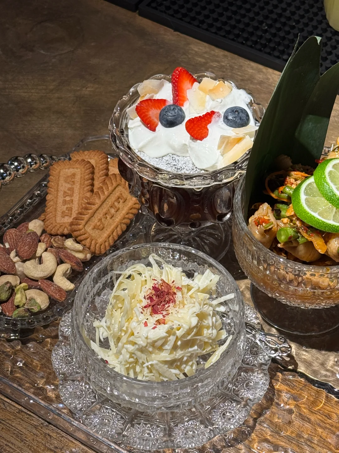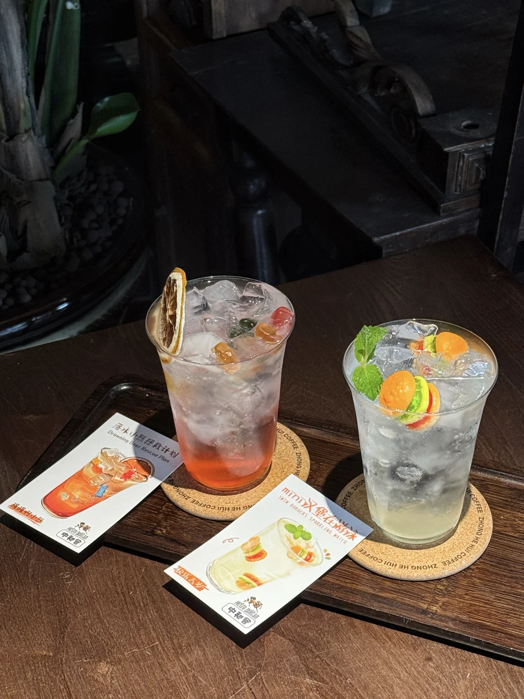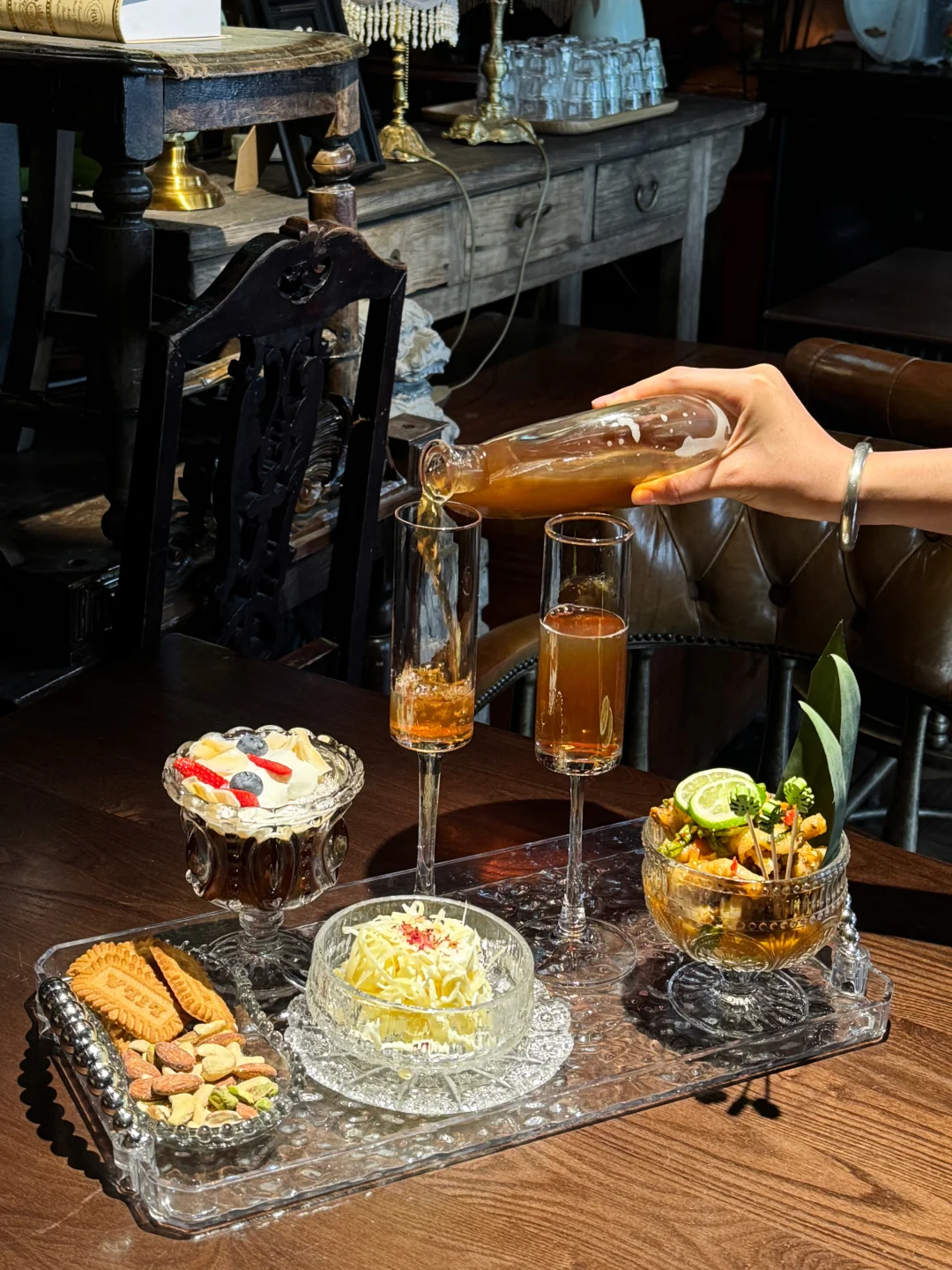 推开雕花木门的瞬间 仿佛跌进王家卫电影里的南洋旧时光 两层复古阁楼藏着令人心颤的美学细节👇 - 📸出片率100%的黄 金机位 ✔️二楼临窗孔雀绿丝绒沙发(下午4点光影绝美) ✔️旋转楼梯处的古董留声机+黄铜壁灯 ✔️吧台手作马赛克拼贴画前举杯抓拍 - 💦 Mini汉堡在游泳 🍔三只迷你可颂汉堡在气泡水里快乐蛙泳,喝之前要先把汉堡捞出来吃掉,30℃的燥热瞬间被KO! 🧸 落水小熊拯救计划 看到透明杯子里溺水的小熊冰块🧊,本颜控直接心软! 再加上一份云南小吃👉舂鸡脚!微辣微酸 简直不要太配~